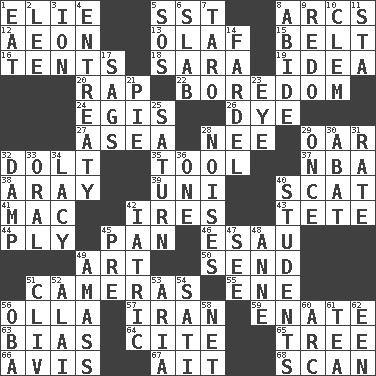 ACROSS 1. Writer Wiesel 5. Fast jet (abbr.) 8. Arches 12. Period of immesurable duration 13. Norwegian king 15. Waist strap 16. Portable shelters 18. "Two Mules for Sister ____" 19. The main thing one is thinking about 20. Hit sharply and swiftly 22. Mood resulting from idleness 24. Armor plate that protects the chest 26. Color 27. Toward the sea 28. Born 29. Rowing implement 32. Dunce 35. Implement 37. Basketball assoc. 38. Like ___ of sunshine 39. University (slang) 40. Get outta here! 41. Big _ 42. Angers 43. False hair 44. Strand of rope, yarn or thread 45. Baking dish 46. He sold his birthright 49. Nonscientific branch of learning 50. Transmit 51. Devices for capturing images 55. Compass dir. 56. Spanish pot 57. SW Asia republic 59. Maternal 63. Prejudice 64. Quote 65. Family _ (genealogy) 66. Advice 67. Small island 68. Examine minutely or intensely DOWN 1. Ingest 2. Area sheltered from the wind 3. Electrically charged atom 4. Plea 5. Distress signal 6. Thick slice 7. Pacific island yam 8. Tolerate 9. Do over again 10. Clement's nick name 11. R.R. building 14. Bundle 17. Sinks 21. Sliced dessert 23. Sight organ 25. Titan orbits this 28. Annoying sounds 29. Single time 30. Blind as ____ 31. Pace 32. Moist 33. Relating to the mouth 34. Made of lace 36. Single 40. SAT takers 42. Of or pertaining to medicine 45. Before (prefix) 47. Observe 48. Queen of England 1702-14 49. Collect or gather 51. 154 in Roman numerals 52. Mountain range southwest of Kyrgyzstan 53. Roberta Peters solo 54. Suttee (variant) 56. Chief or king in Benin or Nigeria 58. Remaining after all deductions 60. Curve 61. Afternoon social gathering 62. Car or cant ending