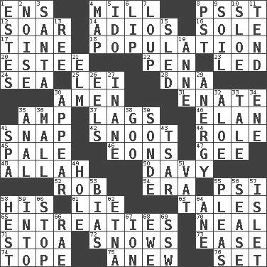 ACROSS 1. Followers of ems 4. Place where flour is made 8. Inconspicuous attention getter 12. Fly high 14. Goodbye (Sp.) 16. Flatfish 17. Prong on a fork 18. Census information 20. First name in cosmetics 22. Writing instrument 23. Directed 24. Ocean 25. Luau accessory 28. Heredity factor (abbr.) 30. So be it 31. Related on the mother's side 35. Electrical Unit 37. Straggles 40. Flair 41. Fastener 42. Snout, nose 44. Hero or heavy, e.g. 45. Light colored 46. Immeasurably long periods of time 47. Unit of force equal to gravity 48. Assad's deity 50. _ Jones' Locker 52. Director Reiner 54. Epoch 55. Air pressure measure (abbr.) 58. Part of HMS, perhaps 61. Whopper 63. Stories 65. Pleas 70. Actress Patricia 71. Portico 72. Overwhelms 73. Relaxation 74. Drink excessively 75. Afresh 76. Arrange properly for use DOWN 1. _____ Park, CO 2. Annoying sound 3. Before Barbara or Clara 4. Atlas unit 5. Wedding promise 6. Mouth edge 7. Central Nebraska county 8. Pacific Standard Time (abbr.) 9. Land 10. _ gin 11. Look after 13. To riddle 15. Downhill vehicle 19. Queen of England 1702-14 21. Shade tree 26. Snakelike fish 27. Silly 29. Disorder of the immune system 30. Seem 32. Medicinal plant 33. Story 34. Compass dir. 35. Of or related to the anus 36. Shopping center 38. Thick or sticky substance 39. Message 41. Health resort 43. Russian ruler of old 49. Hollow 51. Large container 53. Prejudice 55. Entreaties 56. Gospel singer Marvin 57. Small island 58. Command 59. To the inside or interior of 60. Constrict 62. Inactive volcano in Sicily 64. A saturated hydrocarbon 66. Actress Charlotte 67. Electrically charged atom 68. She-sheep 69. Compass dir.