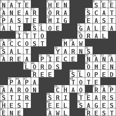 ACROSS 1. Nathan's nickname 5. Layer 8. Perceive with the eye 11. Approach 13. Mouth or opening 14. Leave at once 15. Thick mixture 16. Russian fighter aircraft 17. Compass direction 18. Keyboard modifier key 19. A type of plum 21. An organ shaped like a helmet 22. "Tell ____ the Marines!" 24. Of the mouth 25. Buttonhole 27. Informal term for the mouth 29. Table seasoning 30. Tall tales 32. Length times width 33. Component 35. Nanny 39. Nobles 41. Sign of something about to happen 42. To sift 43. Had an oblique or slanted direction 45. Dad 48. Carry 49. Composer Copland 50. US Secretary of Labor Elaine L. _ 52. Strike 55. Use a swizzle stick 56. Indian title of respect (Mr.) 57. Lacerates 59. Command 60. Snakelike fish 61. Gurus 62. Compass dir. 63. Leather borer 64. Take ten DOWN 1. California wine valley 2. Of or related to the anus 3. A testis 4. Erode 5. Same (prefix) 6. One of the Great Lakes 7. Tired old horse 8. Any of the three canals of the cochlea 9. Artist's stand 10. Singer James 12. Musical pauses 14. Scorch 20. Car dealer's back yard 21. Woman's formal wear 23. "_____ Recall" 25. White ___ sheet 26. Automobile 27. Apple computer (short form) 28. "We ___ not amused" (Victoria) 30. Affirmative reply 31. Snob 33. Before (prefix) 34. Binary compound 36. Electrical Measurement 37. Born 38. Plus 40. NW Algerian seaport 43. R.R. building 44. Plunders 45. Eucharist need 46. Originate 47. Left side of a ship or aircraft 49. American tennis player Robert 50. Ship's personnel 51. Land elevation 53. Ancient Greek god of war 54. Inconspicuous attention getter 56. Ocean 58. Hearing organ