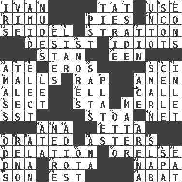 ACROSS 1. "Terrible" tsar 5. Make lace 8. Purpose 11. Tall New Zealand timber tree 12. Sliced desserts 13. Non-commissioned officer (abbr.) 14. A glass for beer 17. Ski resort town in Vermont 19. Cease 21. Foolish or stupid persons 22. Comedian Laurel of Laurel & Hardy 23. Car or cant ending 24. Had dinner 27. Greek god of love 29. _-fi 32. Promenades 34. Strike 36. So be it 37. Toward shelter 38. Pipe bend 39. Give a ring to 40. Religious group 41. R.R. building 42. Haggard of country music 43. Fast jet (abbr.) 44. Portico 46. Was introduced to 47. Nanny (var.) 50. Singer James 52. Spoke pompously 55. Michaelmas daisies 57. Conveyance 59. Threatening words 62. Heredity factor (abbr.) 63. Round or rotation of duties 64. California wine valley 65. Boy, to dad 66. Eastern Standard Time (abbr.) 67. Blind as ____ DOWN 1. Big collection agency 2. Compete 3. Among 4. Unadorned figures 5. Teat (slang) 6. Nest on high 7. Sadhe (variant) 8. To (old English) 9. Native of Scotland 10. Immeasurably long periods of time 12. Pacific Standard Time (abbr.) 15. _____ Park, CO 16. One who doesn't tell the truth 18. Shallow baking pan 20. Sounds asleep 24. Collect or gather 25. Falsehoods 26. Voters do this 28. Table seasonings 29. Excessive but superficial compliments 30. Cell (Danish) 31. An arm off of a larger body of water 33. Allow 35. Food holders 36. Adept person 42. Mother 45. Von Bismarck 47. "One Day ___ Time" 48. Distance measurement (Brit.) 49. Goodbye (Sp.) 51. Sports stadium 52. Likelihood 53. Western Nevada city 54. ____ Jay Lerner 55. Santa ___, CA 56. Thick slice 58. Baseball player Mel 60. Health resort 61. Ingest