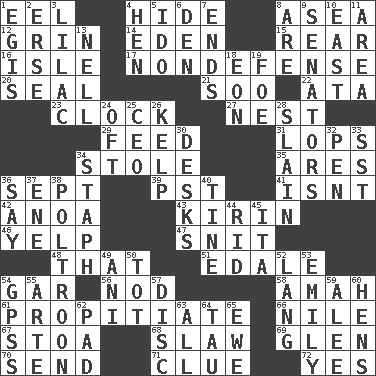 ACROSS 1. Snakelike fish 4. Flintstone garb 8. Toward the sea 12. Smile widely 14. Genesis locale 15. Stern 16. Small island 17. Unrelated to defense, as in spending 20. Lick closed 21. "Barney Miller" actor Jack 22. _ moment's notice (2 wds.) 23. Timepiece 27. Egg locale 29. Nourish 31. Chops off 34. Fur scarf 35. Ancient Greek god of war 36. Back-to-school mo. 39. Pacific Standard Time (abbr.) 41. Is not 42. Small Philippine buffalo 43. Japanese brewing company 46. Sharp bark 47. In a ____ (agitated or irritated) 48. Not this but _ 51. Peak District village in England 54. Slender fish 56. Allow head to fall sleepily 58. Nanny 61. Conciliate 66. Mediterranean tributary 67. Portico 68. Cole _ (cabbage dish) 69. Small, secluded valley 70. Transmit 71. A slight indication 72. Affirmative reply DOWN 1. The front part of a cuirass 2. Celtic language 3. Pale purple color 4. Layer 5. Wedding promise 6. Lair 7. Extremities 8. "We ___ not amused" (Victoria) 9. Legislators 10. 90 degrees 11. Type of rug 13. 1994 drama film starring Jodie Foster 18. Period of immesurable duration 19. Enemy 24. Often (poetically) 25. Corporate head (abbr.) 26. Seaweed 28. Killed 30. Writing tables 32. Fenced enclosure 33. Fast jet (abbr.) 34. Staphylococcus 36. Declare 37. Compass dir. 38. Characterized by complete cowardliness 40. Prong on a fork 44. To free from 45. Call ___ day 49. Cuckoo 50. Small child 52. Long (Scottish) 53. Poet Dickinson 54. Global Positioning Systems (abbr.) 55. Johnson of "Laugh-In" 57. Flat circle 59. Toward shelter 60. Coop moms 62. Groovy apt. 63. 100% 64. The 19th letter of the Greek alphabet 65. She-sheep