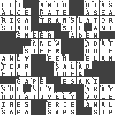 ACROSS 1. Lizard (obsolete) 4. Among 8. Prejudice 12. _ vera 14. Pace 15. At sea 16. Capital of Latvia 17. Interpreter 20. Play the lead 21. Observe 22. Black tropical American cuckoo 23. Scornful expression 27. An important port of Yemen 29. Afresh 31. Blind as ____ 34. Bull 35. Court order 36. Actor Griffith 39. Opposite of masc. 41. Enthusiasm 42. Rend 43. First course 46. Needle holder 47. Long journey 48. Stare wonderingly 51. 1973 Nobel Price Winner (Physics) Leo 54. Quiet! 56. Playfully artful 58. Like ___ of sunshine 61. Rotating or pertaining to rotation 66. Short-tailed, large-bodied rat 67. Angers 68. 4th largest of the Great Lakes 69. Of or related to the anus 70. "Two Mules for Sister ____" 71. Plant excrements 72. Small drink DOWN 1. Hearing organs 2. Sudden quick movement 3. Ancient Roman robes 4. Nonscientific branch of learning 5. Impair 6. Call ___ day 7. Hiding places for outlaws 8. Sound made by sheep 9. Byzantium, centuries later 10. A really long time 11. Indian skirt 13. Merit 18. Ocean 19. Directed 24. Erode 25. Compass dir. 26. Coral ridge 28. Having ears or earlike features 30. Take or capture by force 32. In the manner of 33. "___ Little Indians" 34. Damascus' land 36. Had dinner 37. Remaining after all deductions 38. Female offspring 40. Female horse 44. French article 45. Alias (abbr.) 49. Pacific Standard Time (abbr.) 50. Biblical high priest 52. Polynesian shrub of the pepper family 53. Metal shackles 54. Indian titles of respect 55. Israeli folk dance 57. Jacques Cousteau's middle name 59. Mountain range southwest of Kyrgyzstan 60. Sharp bark 62. White ___ sheet 63. Epoch 64. Mouth edge 65. Affirmative reply