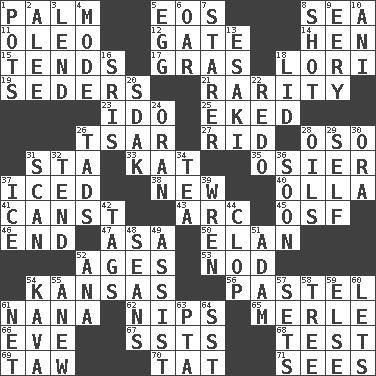 ACROSS 1. Inside of hand 5. Greek goddess of the dawn 8. Ocean 11. Butter sub 12. Yard entry 14. Layer 15. Looks after 17. Pate de foie ____ 18. Australian parrot (variant) 19. Spring feasts 21. Noteworthy scarcity 23. Wedding promise 25. Made supply last 26. Russian ruler of old 27. To free from 28. Bear (Spanish) 31. R.R. building 33. Krazy ___ of comics 35. Flexible twig of a willow tree 37. On the rocks 38. ___ Haven, CT 40. Water jar 41. 2nd pers. sing. pres. of can (arch.) 43. Curve 45. Order of Saint Francis (abbr.) 46. Conclude 47. White ___ sheet 50. Flair 52. Eons 53. Allow head to fall sleepily 54. Sunflower state 56. Soft color 61. Nanny 62. Pinches, bites 65. Haggard of country music 66. First lady 67. Fast planes 68. Trial 69. The 23rd letter of the Hebrew alphabet 70. Make lace 71. Observes DOWN 1. Plant holders 2. Toward shelter 3. Grant temporary use of 4. Method 5. Ovum 6. Boat paddle 7. A viewer who gazes fixedly 8. Opportunity 9. Suggestive of the supernatural 10. Black tropical American cuckoo 13. 1973 Nobel Price Winner (Physics) Leo 16. Indian titles of respect 18. Flaplike covering 20. Neighbor of Neb. 22. Redecorate 24. Northwest Algerian city 26. Small boys 28. Lubricates 29. Automatic 30. Mouth or opening 31. Examine minutely or intensely 32. Look after 34. Beverage made from leaves 36. Within a short period 37. Frozen water 39. Songbird 42. Labels 44. Hoof sound 48. Seines 49. Help 51. First of billions? 52. Santa ___, CA 54. Polynesian shrub of the pepper family 55. Afresh 57. Arranges properly for use 58. Relationship diagram 59. Otherwise 60. Allows 61. Fish or hair follower 63. Parent Teacher Assoc. 64. Fast jet (abbr.)