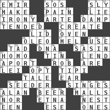 ACROSS 1. Independent ruler or chieftain 5. Distress signal 8. Mischievous 11. Create 12. Ache 14. Falsehood 15. Literary sarcasm 17. Johnson of "Laugh-In" 18. Moist 19. Looked after 21. Cause to be 23. Flaplike covering 25. Baking chamber 26. Butter sub 27. Cartoonist voice _ Blanc 28. Purpose 31. Bit 33. Heredity factor (abbr.) 35. Indian antelope 37. Like (prefix) 38. Shallow baking pan 40. Grant temporary use of 41. To the left, to Queeg 43. Director Reiner 45. "We ___ not amused" (Victoria) 46. Luau accessory 47. Elect 50. Native american tent (variation) 52. Lie 53. Hearing organ 54. Sowing specialist 56. Scorches 61. Actor Alda or Thicke 62. Fermented drink made from hops 65. Shopping centers 66. Not either 67. Inactive volcano in Sicily 68. A home for chicks 69. Car or cant ending 70. Compass dir. 71. Singles DOWN 1. Send forth 2. Female horse 3. Visual representation of an object 4. Tear apart 5. Health resort 6. Boat paddle 7. "Cheers" or "Ellen" 8. Narrow board 9. Citrus frut 10. Slangy assent 13. Boldness 16. Shout 18. One of the 12 tribes of Israel 20. Passed on 22. Snakelike fish 24. Do not 26. Scent 28. One who makes use of a thing 29. Trig term 30. Conclusion 31. Drink excessively 32. Mine, in Marseilles 34. Wind 36. Jai _ 37. Actor Linden 39. Musical sound 42. Frog relative 44. Prejudice 48. Cadet 49. Cigar-shaped 51. Demure 52. Nine, plus one 54. _ gin 55. Merit 57. Billionth: prefix 58. Small, secluded valley 59. Otherwise 60. Fast planes 61. A saturated hydrocarbon 63. Followers of ems 64. Actress Charlotte