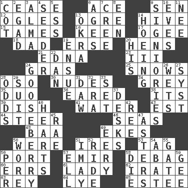 ACROSS 1. Stop 6. Adept person 9. Elected rep. 12. Stares 13. Legendary monster 14. Hub of activity 15. Corrects by punishment or discipline 16. Peachy ____! 17. Double curve, resembling the letter S 18. Male parent 19. Celtic language 20. Coop moms 21. Pulitzer Prize-winning author Ferber 23. One more than two 24. Pate de foie ____ 25. Overwhelms 28. Bear (Spanish) 30. Unclothed pictures 34. Jennifer or Joel 35. Superhero pair 36. Having ears or earlike features 38. It is 39. Food container 41. Wetness 43. Eastern Standard Time (abbr.) 44. Navigate 46. Oceans 48. Sound made by sheep 49. Makes supply last 50. Past tense of be (plural) 51. Angers 53. Label 56. Left side of a ship or aircraft 57. Independent ruler or chieftain 58. Debunk (Brit. slang) 60. Blunders 61. Kenny Rogers chart-topper in '80 62. Feeling or showing extreme anger 63. Marina Del _, California 64. Sodium hydroxide 65. First name in cosmetics DOWN 1. Small bed 2. Mild oath 3. _ mater 4. Sowing specialist 5. Double-curved letter 6. Ripens 7. Algonquian 8. Car or cant ending 9. Seigniories (variant) 10. Nights before holidays 11. Born 13. Gumbo ingredient 14. Weeding 19. Take place subsequently 20. Part of HMS, perhaps 22. Daniel's nick name 24. Sour, prickly fruit 26. Soaks 27. System (abbr.) 28. Probability 29. Set or collection 31. Obsolete 32. Period 33. Arrange properly for use 37. Writing tables 40. Centers of feelings and intuitions 42. To sift 45. Actress Charlotte 47. Michaelmas daisies 49. Suggestive of the supernatural 50. Had on 51. "If ____ say so..." 52. Travel on an animal 54. Blind as ____ 55. Yard entry 56. For each 57. Pipe bend 58. Pass on 59. Unit of force equal to gravity