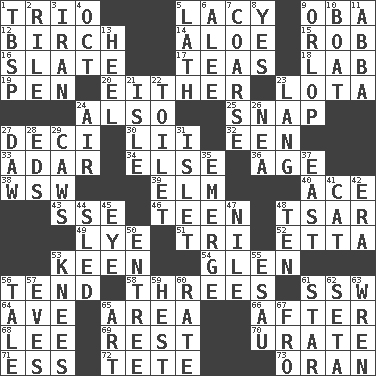 ACROSS 1. Musical group of three 5. Made of lace 9. Chief or king in Benin or Nigeria 12. A tree used for making furniture 14. _ vera 15. Director Reiner 16. Chalkboard 17. Beverages made from leaves 18. Experiment locale 19. Animal enclosure 20. One or the other of two 23. Globular water bottle used in Asia 24. In addition 25. Fastener 27. Tenth: prefix 30. Cards in a Roman deck? 32. Car or cant ending 33. The sixth month of the Jewish calendar 34. Otherwise 36. Mature 38. Compass dir. 39. Shade tree 40. Adept person 43. Compass dir. 46. Adolescent 48. Russian ruler of old 49. Potassium hydroxide 51. Three (prefix) 52. Singer James 53. Peachy ____! 54. Small, secluded valley 56. Be inclined (to) 58. Threesomes 61. Compass dir. 64. "___ Maria" 65. Length times width 66. Following 68. Area sheltered from the wind 69. Take ten 70. A salt of uric acid 71. Double-curved letter 72. False hair 73. Northwest Algerian city DOWN 1. Cook's measure (abbr.) 2. Cause heat under the collar 3. SW Asia republic 4. Sep. follower 5. Thin strip of wood or metal 6. Toward shelter 7. Rough 8. It is so 9. Lowest deck of a ship 10. Water vessel 11. Swedish rock group 13. The bottom of a shoe or boot 21. Small island 22. Bathroom plumbing fixture 23. Austrian-born American filmmaker Fritz 24. Wind 26. Teachers' org. 27. Simpleton 28. Begley and Asner 29. Crow sounds 31. Small island 35. Develop 37. 90 degrees 41. Domesticated feline 42. Epoch 44. Downhill vehicle 45. Sight organ 47. "Death on the ____" 48. "___ Little Indians" 50. Main course 53. Leg joints 55. Son of Isaac 56. Lie 57. Nights before holidays 59. Command 60. Assign a rank or rating to 61. Play the lead 62. Bristle 63. Songbird 65. Tate display 67. Back