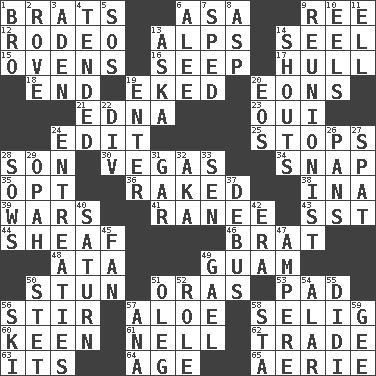 ACROSS 1. Naughty children 6. White ___ sheet 9. To separate or throw off 12. Cowboy competition 13. High mountains 14. Sew up the eyelids of hawks and falcons 15. Baking chambers 16. Ooze 17. Frame or body of a ship 18. Conclusion 19. Made supply last 20. Immeasurably long periods of time 21. Pulitzer Prize-winning author Ferber 23. Fr. "Yes" 24. Prepare for publication 25. Obstructs or blocks passage 28. Male offspring 30. Viva Las _ 34. Fastener 35. Choose 36. Moved through 38. _ tizzy (2 wds.) 39. Armed conflicts 41. The wife of a rajah (variant) 43. Fast jet (abbr.) 44. To gather and bind into a bundle 46. Naughty child 48. _ moment's notice (2 wds.) 49. Island territory of the United States 50. Surprise greatly 51. Mouths or openings 53. Groovy apt. 56. Move through with a circular motion 57. Medicinal plant 58. Former Milwaukee Brewers owner Bud 60. Peachy ____! 61. 1994 drama film starring Jodie Foster 62. Barter 63. ___ a Wonderful Life 64. Mature 65. Nest on high DOWN 1. Sis' sibling 2. Be footloose 3. An important port of Yemen 4. Looked after 5. Mayday 6. Toward shelter 7. Broke a traffic law 8. Viper 9. One who advocates reunion 10. Snakelike fish 11. Pipe bend 13. "____ silly question..." 14. Yells 19. Keyboard key 20. Greek goddess of the dawn 22. HTML Container Element 24. Pleas 26. Baking dishes 27. Argument over a trivial matter 28. Sty mamas 29. Brightly colored fish 31. Slender fish 32. Alias (abbr.) 33. Elected rep. 37. To get out of a bus 40. Titan orbits this 42. Epoch 45. Air blower 47. Electrical Unit 49. Highlander 50. Proofreading order 51. Cassini of fashion 52. Hero or heavy, e.g. 54. Having or resembling wings 55. "You Light Up My Life" star Conn 56. What Jean-Claude Killy likes to do 57. Santa ___, CA 58. R.R. building 59. Unit of force equal to gravity