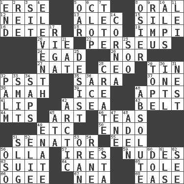ACROSS 1. Celtic language 5. Sep. follower 8. Taken by mouth 12. Famous astronaut Armstrong 13. Actor Baldwin 15. Filth; sediment 16. Prevent from occurring 18. Printing process, for short 19. Body of Kaffir warriors 20. Compete 22. Son of Zeus who helped slay Medusa 24. Mild oath 26. Not either 27. Nathan's nickname 28. Corporate head (abbr.) 29. Metal container 32. Inconspicuous attention getter 35. "Two Mules for Sister ____" 37. Single 38. Housemaid 39. Frozen water 40. Tenement units (abbr.) 41. Mouth edge 42. Toward the sea 43. Waist strap 44. Mountains (abbr.) 45. Tate display 46. Afternoon social gatherings 49. And so on (abbr.) 50. Inside; within (prefix) 51. Elected representative 55. Snakelike fish 56. Rounded earthenware pot or jar 57. Angers 59. Unadorned figures 63. Set of matching outer garments 64. Patter 65. Lacquered or enameled metalware 66. Double curve, resembling the letter S 67. Teachers' org. 68. Relaxation DOWN 1. Conclude 2. Portuguese money of account (variant) 3. Be seated 4. Veterans Day date 5. Boat paddle 6. Hoof sound 7. Wig 8. Flexible twig of a willow tree 9. Tall New Zealand timber tree 10. High mountains 11. Luau accessory 14. Pupil covering 17. Port city in Latvia 21. Ingest 23. "Barney Miller" actor Jack 25. Cease 28. Make 29. Drink excessively 30. International (abbr.) 31. A home for chicks 32. Inside of hand 33. Stricken, poetically 34. Plant excrements 36. Adept person 40. Utter; complete 42. Northern region 45. "One Day ___ Time" 47. Compass dir. 48. An important port of Yemen 49. Maternal 51. Strike heavily 52. Writer Wiesel 53. NW Algerian seaport 54. French philosopher Descartes 56. Bear (Spanish) 58. R.R. building 60. ___ good deed 61. Raised railways 62. Perceive with the eye