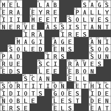 ACROSS 1. Cartoonist voice _ Blanc 4. Experiment locale 7. Settles 11. Epoch 12. Jane of fiction 13. Chummy 14. One more than two 15. Confront 16. Finds the solution 17. Impudent aggressiveness 19. Helper 21. Lyricist Gershwin 23. Angers 24. Wise men 25. Grow older 26. Black tropical American cuckoo 29. Having a sole or soles 30. Followers of ems 31. "Barney Miller" actor Jack 32. Writing tablet 33. Big collection agency 34. Player for Phoenix 35. Sorrow 36. _-fi 37. All-night dance parties 40. Begley and Asner 41. Area sheltered from the wind 42. Inky black, to poets 43. Glance over 45. Pipe bend 46. Decision 51. Principle of right and wrong 55. Foolish or stupid persons 56. Moves 58. Binary compound 59. Impressive in appearance 60. For fear that 61. Lair 62. Celtic language 63. Raised railways 64. Ingest DOWN 1. Count _ (2 wds.) 2. 4th largest of the Great Lakes 3. Den 4. Potassium hydroxide 5. Type of rug 6. Wagers 7. Table seasonings 8. Inventor's middle name 9. Small, secluded valley 10. System (abbr.) 12. Develop 13. Airs 16. Begets 18. Small bottle 20. Attaches a signature 22. Assist 24. Methods 25. Nest on high 26. NE Netherlands city 27. Common sense 28. Electrically charged atom 29. Saudi Arabian king (1953-1964) 32. Before (prefix) 33. Ancient Celtic tribe of eastern Britain 36. Narrow boards 37. To riddle 38. Most capable 39. Electrical Unit 43. Fur scarf 44. Quote 46. Trig term 47. Scent 48. Teases 49. Stare 50. Christmas carol 52. Flintstone garb 53. It may be bright or harebrained 54. Penny 57. Curvy letter