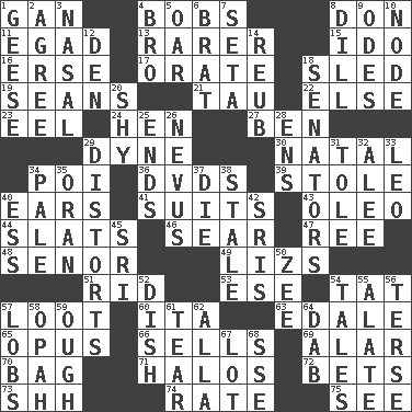 ACROSS 1. Separate the seeds from cotton 4. Moves up and down 8. Spanish title 11. Mild oath 13. Less widely known 15. Wedding promise 16. Celtic language 17. Speak pompously 18. Downhill vehicle 19. Seines 21. The 19th letter of the Greek alphabet 22. Otherwise 23. Snakelike fish 24. Layer 27. Benjamin's nick name 29. Centimeter-gram-second unit of force 30. Brizilian seaport 34. Luau course 36. Movie discs 39. Took without asking 40. Hearing organs 41. Costumes for special activities 43. Margarine 44. Narrow boards 46. Wither 47. To sift 48. Sir (Sp.) 49. Belonging to Elizabeth 51. To free from 53. Compass dir. 54. Make lace 57. Plunder 60. Call ___ day 63. Peak District village in England 65. Musical composition 66. Makes a sale 69. Having or resembling wings 70. Container for groceries 71. Saint headwear 72. Wagers 73. Quiet! 74. Assign a rank or rating to 75. Perceive with the eye DOWN 1. Honkers 2. Match 3. Rhinal 4. Sis' sibling 5. Boat paddle 6. Naughty child 7. Stalk of a moss capsule 8. Deli pickle 9. Lyric poems 10. Thickened enlargement 12. Lair 14. Reuben's nickname 18. Legislators 20. Like a shrinking violet 25. Extremities 26. Mole, birthmark 28. Followers of ems 29. What propaganda does 31. Lacquered or enameled metalware 32. Toward shelter 33. Lion 34. Light colored 35. NW Algerian seaport 37. Pass on 38. Lacking originality or spontaneity 40. Double-curved letter 42. Indian titles of respect 45. Indian title of respect (Mr.) 50. Last letter of the English alphabet 52. Food container 54. Stories 55. Having winglike extensions 56. Laconic 57. Tennis shots 58. Brightly colored fish 59. Ending for "Through" and "Enough" 61. Rend 62. Silent film actress Nazimova 64. Pat or tap gently 67. Car dealer's back yard 68. Compass dir.