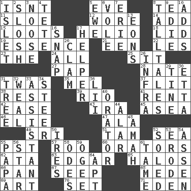 ACROSS 1. Is not 5. First lady 8. Afternoon social gathering 11. A type of plum 12. Had on 14. Find the sum of 15. Plunders 17. Sun: prefix 18. Hat (slang) 19. Center 21. Car or cant ending 22. French article 23. Definite Article 24. 100% 25. Be seated 27. Infant food 28. Nathan's nickname 31. It was, poetically 35. Cartoonist voice _ Blanc 37. Secret move to avoid paying debts 38. Take ten 39. River (Sp.) 41. Monthly bill 42. Relaxation 43. Retirement account (abbr.) 45. Toward the sea 46. Writer Wiesel 47. Insect wing 49. Indian title of respect (Mr.) 51. Scottish cap 52. Ocean 55. Pacific Standard Time (abbr.) 57. Friend of Pooh 60. Speakers 62. _ moment's notice (2 wds.) 63. _ Allan Poe 65. Rings 66. Baking dish 67. Ooze 68. Ancient Persian 69. Nonscientific branch of learning 70. Put into a specified state 71. Genesis locale DOWN 1. Small island 2. Splash clumsily 3. Trap for birds or small mammals 4. False hair 5. She-sheep 6. Grand slam 7. One of the Great Lakes 8. Baron Munchausen's specialties 9. Singer Brickell 10. Does sums 13. Immeasurably long periods of time 16. Fastener 17. Aide 20. Dollar (slang) 26. Kind of red light 29. Prong on a fork 30. Singer James 31. Relationship diagram 32. Welt 33. Aide 34. Guide 36. Cards in a Roman deck? 40. Speaker 44. Having or resembling wings 48. Nanny 50. Angers 52. Having a sole or soles 53. Wear away 54. NE Netherlands city 55. Dad 56. Play the lead 58. Lyric poems 59. Double curve, resembling the letter S 61. Not wild 64. Fitting