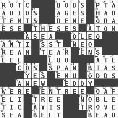 ACROSS 1. College mil. group 5. Moves up and down 9. Parent Teacher Assoc. 12. Goodbye (Sp.) 14. Eras 15. Possessed 16. Portable shelters 17. French philosopher Descartes 18. Mouth or opening 19. Compass dir. 20. College papers 23. Tiny particle 24. At sea 25. Margarine 27. Opposed to 30. Fast jet (abbr.) 32. Modern: prefix 33. 480, 500 or 516 sheets of paper 34. Pull apart 36. Followers of ems 38. Snakelike fish 39. Nilotic language 40. Had dinner 43. Music discs 46. Connect, as a bridge 48. Prejudice 49. Consenting reply 51. Australian flightless bird 52. Likelihood 53. Afresh 54. Whirlpool 56. We are 58. Main course 61. Clumsy lout 64. Biblical high priest 65. Woody plant 66. Impressive in appearance 68. Nervous spasm 69. Advice 70. Collection of objects 71. Ocean 72. Waist strap 73. Necklace unit DOWN 1. Pace 2. Lyric poems 3. Prong on a fork 4. Small bed 5. Soap units 6. Double curve, resembling the letter S 7. Gillaume's butler role 8. Compass dir. 9. Picture 10. Edible starchy tuberous root 11. First of billions? 13. Fast planes 21. Command 22. Artist's stands 23. A really long time 24. Direct toward a target or goal 26. Area sheltered from the wind 27. "We ___ not amused" (Victoria) 28. Born 29. Baby powder 31. Grayish beige 35. Wanderer 37. Expressed in words 41. Small amount or degree 42. Double-curved letter 44. Centimeter-gram-second unit of force 45. Observe 47. Naked 48. Male child 50. Turn aside suddenly 53. N. Chile seaport 55. Undesirable depression on a surface 56. Moistens 57. Writer Wiesel 59. Famous astronaut Armstrong 60. Trial 61. Mitch Miller's instrument 62. Inventor's middle name 63. Nourish 65. Keyboard key 67. Globe