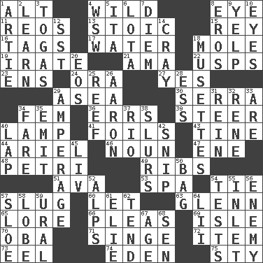 ACROSS 1. The first octave above the treble staff 4. Uncontrolled 8. Sight organ 11. Vintage cars 13. Unemotional 15. Marina Del _, California 16. Labels 17. Wetness 18. Undercover agent 19. Feeling or showing extreme anger 21. Wet nurse (var.) 22. United States Postal Service (abbr.) 23. Followers of ems 24. Mouth or opening 27. Affirmative reply 29. At sea 30. Father Junipero _ 34. Opposite of masc. 36. Blunders 39. Guide 40. Desk light 41. Fencing necessities 43. Prong on a fork 44. Satellite of Uranus 46. Part of speech 47. Compass dir. 48. _ dish (used to culture cells) 49. Teases 51. Actress Gardner 53. Health resort 54. Standoff 57. Snaillike creature with no shell 60. Allow 63. American astronaut and politician John 65. Old wives' tales, e.g. 66. Entreaties 69. Capri or Wight 70. Chief or king in Benin or Nigeria 71. Burn superficially 72. A distinct part 73. Snakelike fish 74. Genesis locale 75. Filthy place DOWN 1. Nick name for Arthur 2. Memorize 3. Ancient Roman robes 4. Compass dir. 5. Call ___ day 6. Globular water bottle used in Asia 7. South Vietnam president (1954) 8. Greek god of love 9. Sharp bark 10. Snake ____ (dice throw) 12. Fast jet (abbr.) 14. Supercomputer manufacturer 18. French bagpipes 20. Greek goddess of the dawn 25. Coral collection 26. Composer Copland 28. Curvy letter 29. Electrical Measurement 31. It's straight from the horse's mouth 32. French philosopher Descartes 33. "We ___ not amused" (Victoria) 34. Conductor's collection 35. Give off 37. _ de Janeiro 38. Plays smoothly or legato 40. Infant locale 42. Clip 45. 54 in ancient Rome 50. Container for groceries 52. High mountains 54. Trials 55. An arm off of a larger body of water 56. Foe 57. _ gin 58. Ear part 59. Mountain range 61. Writer Wiesel 62. Be inclined (to) 64. Cards in a Roman deck? 67. Mature 68. Elected rep.