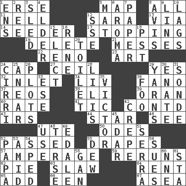 ACROSS 1. Celtic language 5. Atlas unit 8. 100% 11. 1994 drama film starring Jodie Foster 12. "Two Mules for Sister ____" 13. By way of 14. Sowing specialist 17. Closing up, plugging up 19. Keyboard key 21. Makes clutter 22. Western Nevada city 23. Nonscientific branch of learning 24. Head covering 27. To provide with a ceiling 29. Consenting reply 32. An arm off of a larger body of water 34. 54 in ancient Rome 36. Papal veil 37. Vintage cars 38. Connecticut Ivy Leaguer 39. Northwest Algerian city 40. Assign a rank or rating to 41. Nervous spasm 42. Continued (abbr.) 43. Big collection agency 44. Play the lead 46. Observe 47. Shoshoni 50. Lyric poems 52. Went by 55. Window treatments 57. Electrical Measurement 59. Summer TV shows 62. Sliced dessert 63. Cole _ (cabbage dish) 64. Monthly bill 65. Increase 66. Car or cant ending 67. Toward the sea DOWN 1. Followers of ems 2. To sift 3. Downhill vehicle 4. A person who is older than you are 5. Floor protector 6. Scent 7. Some stationery 8. Deliberation 9. Actor's bit 10. Straggles 12. Compass dir. 15. Voters do this 16. French philosopher Descartes 18. Pacific Standard Time (abbr.) 20. Bathroom 24. High-altitude cloud 25. Approach 26. Small pieces of grounds 28. Ms. Damita and namesakes 29. Entertaining tales 30. Related on the mother's side 31. Message 33. Compass dir. 35. Winning man's name 36. Egg _ yung 42. Streamer paper 45. The sixth month of the Jewish calendar 47. Purpose 48. Laconic 49. Peak District village in England 51. Spanish missionary in California 52. Dad 53. Among 54. Broke a traffic law 55. Morning condensation 56. Institutes legal proceedings 58. Separate the seeds from cotton 60. Compass dir. 61. R.R. building