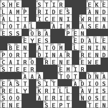 ACROSS 1. A female animal or person 4. Commotion 8. Supplement with great effort 11. Desk light 13. Amusement-park features 15. Plus 16. Set down 17. Ancient Celtic tribe of eastern Britain 18. Songbird 19. "_____ Recall" 21. Direct toward a target or goal 22. Toward the sea 23. Curvy letter 24. Chief or king in Benin or Nigeria 27. Animal enclosure 29. Sight organs 30. Peak District village in England 34. Benjamin's nick name 36. Tiny particle 39. Soviet premier 1918-24 40. Left side of a ship or aircraft 41. Middle Eastern gold or silver currency 43. Tear apart 44. Capital of Egypt 46. French philosopher Descartes 47. She-sheep 48. Navigate 49. Independent ruler or chieftain 51. American Automobile Association (abbr.) 53. Small child 54. Heredity factor (abbr.) 57. Compass direction 60. Be seated 63. Goodbye (Sp.) 65. Depend 66. The principal food of baleen whales 69. Opinion 70. "Barney Miller" actor Jack 71. Nest on high 72. Olfactory organ 73. Compass dir. 74. Back-to-school mo. 75. "___ Little Indians" DOWN 1. Schedule 2. Radiant circles of light 3. Sends forth 4. Indian title of respect (Mr.) 5. Nervous spasm 6. The content of cognition 7. Painter Guido (1575-1642) 8. Hearing organs 9. Leg joint 10. Pulitzer Prize-winning author Ferber 12. Parent Teacher Association (abbr.) 14. Simple or foolish person 18. Roamer 20. Myrna of the movies 25. Necklace unit 26. Moving about 28. Snakelike fish 29. Plea 31. Afresh 32. Actor's bit 33. Conclude 34. Water vessel 35. 4th largest of the Great Lakes 37. Single 38. French painter Edouard 40. Personal Computers (abbr.) 42. San ____ (Riviera town) 45. Mouth or opening 50. Call ___ day 52. "____ silly question..." 54. A piece of turf (Scot.) 55. Annoying sound 56. NE Netherlands city 57. Celtic language 58. A really long time 59. _ gin 61. Angers 62. Hoop that covers a wheel 64. Daniel's nick name 67. Mouth edge 68. Allow