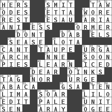 ACROSS 1. Possessive pronoun 5. Stricken, poetically 9. The 23rd letter of the Hebrew alphabet 12. Lyric poems 13. Singer James 14. Had on 15. Respite 16. Son of Isaac 17. Operatic vocal solo 18. Black tropical American cuckoo 19. Curvy letter 21. Abalone 22. Do not 24. Small moist lump or mass 26. Raised railways 27. Gospel singer Marvin 28. Globular water bottle used in Asia 29. Patter 30. Grayish beige 32. Capital and largest city of Mongolia 36. Bowlike part 37. Compass dir. 38. Within a short period 39. Sliced desserts 40. Memorize 42. On the rocks 43. Letter starter 44. Pig sounds 46. Label 49. And not 50. Goad 51. Phillipine bananalike plant 53. Girls' org. (abbr.) 54. "___ Little Indians" 57. Pale green bean 58. Fly high 61. _ and Stitch 62. Prepare for publication 63. Diluted with white 64. A single undivided whole 65. Elected rep. 66. Like ___ of sunshine 67. Double curve, resembling the letter S DOWN 1. Israeli folk dance 2. Paradise 3. Home 4. Fast jet (abbr.) 5. Perceives with the eye 6. Mountains (abbr.) 7. Call ___ day 8. The 19th letter of the Greek alphabet 9. Singer Mel 10. Satellite of Uranus 11. Erodes 14. Armed conflict 19. Followers of ems 20. Proofreading order 21. Chief or king in Benin or Nigeria 23. Expletives 24. Drug addict 25. Had dinner 27. Indian skirt 28. Type of eclipse 29. Head covering 31. Approach 32. Exploiting 33. Shooting up abruptly 34. Leaves 35. Added to 40. Lion 41. Horse sense 43. Heredity factor (abbr.) 45. Retirement account (abbr.) 46. Stories 47. Stay 48. Homeless child 52. Feline 53. Jennifer or Joel 55. Writer Wiesel 56. Brief written record 58. Health resort 59. Boat paddle 60. In the manner of 61. Nilotic language