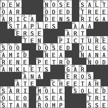 ACROSS 1. Morning condensation 4. Olfactory organ 8. Table seasoning 12. Boat paddle 13. Wrote a lyric poem 14. Family _ (genealogy) 15. N. Chile seaport 18. Habitations of wild animals 19. Capital of Latvia 20. Paper fasteners 22. Auto club (abbr.) 23. Celtic language 24. Tate display 25. Nine, plus one 26. Photo 30. "Barney Miller" actor Jack 33. Administered medicine 36. Cassini of fashion 37. Among 39. Teachers' org. 40. Grandmother 41. French philosopher Descartes 42. Stone: prefix 44. Dreamland 45. Short socks 47. Slender fish 50. Santa ___, CA 51. Greek god of love 53. Had dinner 54. Leopard's kin 57. Indian skirt 59. Undercover agent 61. Having a sole or soles 63. Margarine 64. At sea 65. Three (prefix) 66. Comedian Laurel of Laurel & Hardy 67. Play 68. Compass dir. DOWN 1. ___ good deed 2. Hearing organs 3. Compose 4. Thickened enlargement 5. Lyric poems 6. Elected rep. 7. Begley and Asner 8. Ski resort town in Vermont 9. Roberta Peters solo 10. Part of a journey 11. Afternoon social gathering 16. Heavy open wagon 17. Domed church section 21. Grant temporary use of 22. Curve 24. Assist 26. Lightbulb-shaped fruit 27. ____ Bator 28. Western Nevada city 29. Mild oath 30. "Two Mules for Sister ____" 31. Sign of something about to happen 32. Pig sound 34. Washington bills 35. Put into a specified state 38. Accusation by an informer 42. Parent Teacher Assoc. 43. Double curve, resembling the letter S 46. Compass dir. 48. Ancient Greek god of war 49. Printing process, for short 52. Table seasonings 53. Type of rug 54. Clement's nick name 55. Pile 56. Possessive pronoun 57. Distress signal 58. Keyboard modifier key 59. Impair 60. Bear (Spanish) 62. Expire