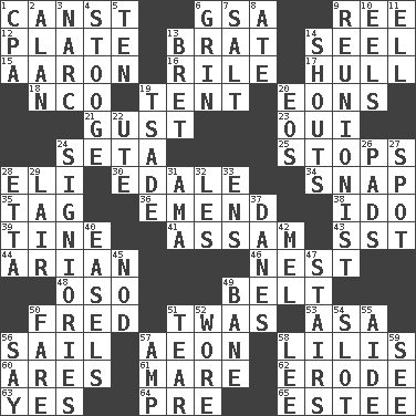 ACROSS 1. 2nd pers. sing. pres. of can (arch.) 6. Girls' org. (abbr.) 9. Portuguese money of account (variant) 12. Food holder 13. Naughty child 14. Stitch closed the eyes of (a falcon) 15. Composer Copland 16. Cause heat under the collar 17. Frame or body of a ship 18. Non-commissioned officer (abbr.) 19. Portable shelter 20. Immeasurably long periods of time 21. Abrupt rush of wind 23. Fr. "Yes" 24. Bristle 25. Closes up, plugs up 28. Biblical high priest 30. Peak District village in England 34. Fastener 35. Label 36. Make improvements or corrections to 38. Wedding promise 39. Prong on a fork 41. Indian state 43. Fast jet (abbr.) 44. Believer in; advocate of (suffix) 46. Egg locale 48. Bear (Spanish) 49. Waist strap 50. Flintstone 51. It was, poetically 53. White ___ sheet 56. Move on water 57. A really long time 58. Ms. Damita and namesakes 60. Ancient Greek god of war 61. Female horse 62. Wear away 63. Consenting reply 64. Before (prefix) 65. First name in cosmetics DOWN 1. Numbers guy (abbr.) 2. ____ Jay Lerner 3. Drug cop 4. Moe Howard, for one 5. Nine, plus one 6. Amused look 7. Table seasoning 8. Had dinner 9. One who advocates reunion 10. Snakelike fish 11. Pipe bend 13. Cy Young winner Saberhagen 14. Yells 19. Sadhe (variant) 20. Greek goddess of the dawn 22. Shoshoni 24. Seigniories (variant) 26. Writing tablets 27. Specific locale 28. Singer James 29. Den 31. Wet nurse (var.) 32. French article 33. Followers of ems 37. Natives or inhabitants of Denmark 40. Artist's stands 42. Cartoonist voice _ Blanc 45. Lower and raise head in agreement 47. Flight of steps 49. Object of repulsion 50. Conductor's collection 51. Pull into pieces 52. Had on 54. Narrow opening 55. Helper 56. Declare 57. Electrical Unit 58. Area sheltered from the wind 59. Observe