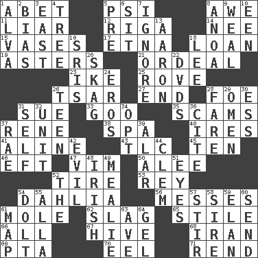 ACROSS 1. Collude with 5. Air pressure measure (abbr.) 8. Deep reverence 11. One who doesn't tell the truth 12. Capital of Latvia 14. Born 15. Flower holders 17. Inactive volcano in Sicily 18. Grant temporary use of 19. Michaelmas daisies 21. Severe or trying experience 23. Mamie's mate 25. Be footloose 26. Russian ruler of old 27. Conclude 28. Enemy 31. Institute legal proceedings 33. Thick or sticky substance 35. Fraudulent business schemes 37. French philosopher Descartes 38. Health resort 40. Angers 41. Place in a line 43. Affectionate concern, for short 45. "___ Little Indians" 46. Bank Draft (abbr.) 47. Zeal 50. Toward shelter 52. Hoop that covers a wheel 53. Marina Del _, California 54. A pale violet or amethyst color 56. Makes clutter 61. Undercover agent 62. Volcanic refuse 65. Vertical member of a panel or frame 66. Everything 67. Hub of activity 68. SW Asia republic 69. Parent Teacher Association (abbr.) 70. Snakelike fish 71. Tear apart DOWN 1. Inventor's middle name 2. Prejudice 3. Compass direction 4. Woody plant 5. Before (prefix) 6. Be seated 7. Disregard 8. Small Philippine buffalo 9. Welt 10. Car or cant ending 13. Composer Copland 16. Indian titles of respect 18. Area sheltered from the wind 20. Heroin 22. Movie discs 24. Greek god of love 26. Adolescent 28. Conductor's collection 29. Sign of something about to happen 30. Double-curved letter 31. Oneself 32. A single undivided whole 34. Elect 36. Quote 37. Actress Charlotte 39. Having or resembling wings 42. Morally bad or wrong 44. Clement's nick name 48. From or relating to Ireland 49. Ear of corn 51. Snake ____ (dice throw) 52. Definite Article 54. Stupid person 55. Silent film actress Nazimova 57. Commotion 58. Title for a man of rank and authority 59. Style 60. Transmit 61. Atlas unit 63. "___ Maria" 64. Set