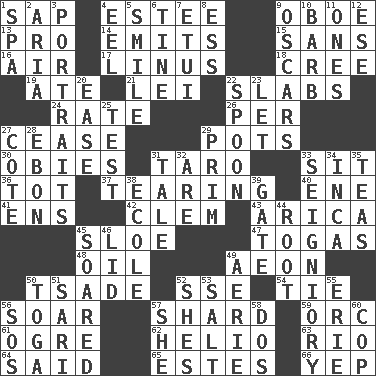 ACROSS 1. Plant excrement 4. First name in cosmetics 9. Mitch Miller's instrument 13. Adept person 14. Sends forth 15. Without 16. Wind 17. "_ and Lucy" (Charlie Brown theme song) 18. Algonquian 19. Had dinner 21. Luau accessory 22. Broad, flat, thick pieces 24. Assign a rank or rating to 26. For each 27. Desist 29. Cooking vessels 30. Off-Broadway awards 31. Pacific island yam 33. Be seated 36. Small child 37. Lacerating 40. Compass dir. 41. Followers of ems 42. Clement's nick name 43. N. Chile seaport 45. A type of plum 47. Ancient Roman robes 48. Petroleum 49. Period of immesurable duration 50. Sadhe (variant) 52. Compass dir. 54. Neckwear 56. Fly high 57. Broken piece 59. The grampus (Milton) 61. Legendary monster 62. Sun: prefix 63. River (Sp.) 64. Stated 65. _____ Park, CO 66. Slangy assent DOWN 1. Health resort 2. Roberta Peters solo 3. Likenesses of persons 4. Snakelike fish 5. Grin 6. Prong on a fork 7. Needle case 8. Double-curved letter 9. Motion picture awards 10. Sharp remark 11. Singles 12. Compass dir. 20. Comfort 22. Soup utensil 23. Allow 25. Trial 27. ____ d'Azur (French Riviera) 28. Inky black, to poets 29. Demure 31. Story 32. "We ___ not amused" (Victoria) 33. Signiory (variant) 34. South American Indian 35. Beverages made from leaves 38. Learning spot: Fr. 39. Yard entry 44. Carrot, for example 45. Flew 46. Hat (slang) 49. Nest on high 50. Ancient Roman robe 51. Indian skirt 52. "______ My Girl" (Turtles hit) 53. Table seasoning 55. One of the Great Lakes 56. Mayday 57. A female animal or person 58. Two (Sp.) 60. Police officer (slang)