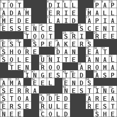 ACROSS 1. Small child 4. Deli pickle 8. Infant food 11. First man 13. 4th largest of the Great Lakes 14. Promenade 15. Ancient Persian 16. Put down 17. Capital of Western Samoa 18. Substance 21. Aroma 22. A blast of a horn 23. _ Lanka 25. To riddle 26. Eastern Standard Time (abbr.) 29. Orators 32. Dinah or Pauly 34. One of the 12 tribes of Israel 35. Erode 38. Flatfish 39. Join together 41. Of or related to the anus 43. Nine, plus one 44. Friend of Pooh 45. Scent 46. Consumed 50. Viper 51. Nanny (var.) 54. Snakelike fish 55. Conclusions 57. Father Junipero _ 59. Inhabiting a nest 63. Portico 64. Wrote a lyric poem 67. Length times width 68. Celtic language 69. General guideline 70. Respite 71. Born 72. Lacking warmth 73. A female animal or person DOWN 1. Docile 2. Lyric poems 3. Bits 4. Keyboard key 5. Retirement account (abbr.) 6. Cards in a Roman deck? 7. Directed 8. Some stationery 9. Place in a line 10. Food holder 12. Confront 14. Big _ 19. Olfactory organ 20. Police officer (slang) 21. Title for a knight 23. Three-handed card game 24. French philosopher Descartes 26. Double-curved letter 27. Attempt 28. Lacquered or enameled metalware 30. Goodbye (Sp.) 31. Singe 33. Painter Guido (1575-1642) 36. Small Philippine buffalo 37. Scottish caps 39. Goad 40. Christmas carol 42. Infant locale 45. Sums up 47. Teachers' org. 48. Looked after 49. Compass dir. 51. NE Netherlands city 52. Distance measurement (Brit.) 53. Came up 56. Play the lead 58. Actress Charlotte 60. Angers 61. Tender 62. Yard entry 64. The grampus (Milton) 65. Superhero pair 66. Pipe bend