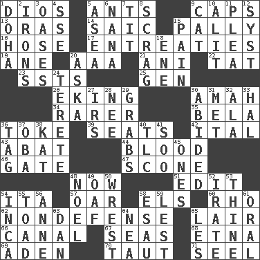 ACROSS 1. "Vaya con ____" 5. Pismires 9. Balmoral and tarboosh 13. Mouths or openings 14. Ketch in the Levant 15. Chummy 16. Flexible conduit 17. Pleas 19. One (Scot) 20. Auto club (abbr.) 21. Black tropical American cuckoo 22. Make lace 23. Fast planes 25. Commissioned mil. rank 26. Supplementing with great effort 30. Housemaid 34. More uncommon 35. Actor Lugosi 36. Puff or smoke 39. Theater features 42. Slanted text style (abbr.) 43. Blind as ____ 44. Vital fluid 46. Yard entry 47. Biscuitlike quick bread 48. Immediately 51. Prepare for publication 54. Call ___ day 57. Rowing implement 58. Raised railways 60. 17th letter of the Greek alphabet 62. Unrelated to defense, as in spending 65. Den 66. Lessep's creation 67. Oceans 68. Inactive volcano in Sicily 69. Arabian gulf 70. Pulled tight 71. Sew up the eyelids of hawks and falcons DOWN 1. Capital of the state of Qatar 2. Removes the wrinkles 3. Fertile tracts in a desert 4. Compass dir. 5. At sea 6. Grandmother 7. Teat (slang) 8. Lean end of the neck 9. Domesticated feline 10. Came down and settled, as after flight 11. Entreaty 12. System (abbr.) 15. Ache 18. Compass dir. 20. "____ silly question..." 24. Cylindrical with tapered ends 27. Big collection agency 28. Born 29. Takes hold of 30. Tolerated 31. Was introduced to 32. Insect wing 33. Actor Linden 36. Label 37. Chief or king in Benin or Nigeria 38. Krazy ___ of comics 40. Affectionate concern, for short 41. "Barney Miller" actor Jack 45. Singles 48. Christmas carol 49. Clumsy lout 50. Take or capture by force 52. Feeling or showing extreme anger 53. One or ones belonging to thee 54. South American Indian 55. Frog relative 56. Singer Murray 58. Son of Isaac 59. For fear that 61. Spoken 63. One of the 12 tribes of Israel 64. Teachers' org. 65. French article