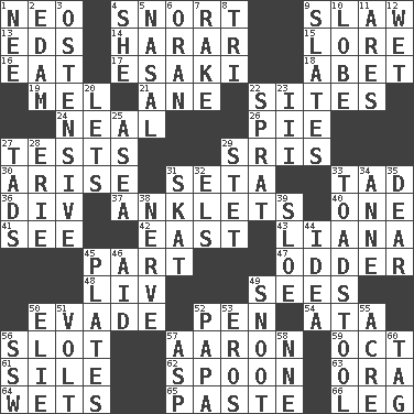 ACROSS 1. Modern: prefix 4. Derisive sound 9. Cole _ (cabbage dish) 13. Begley and Asner 14. Ethiopian city, capital of Harari 15. Old wives' tales, e.g. 16. Ingest 17. 1973 Nobel Price Winner (Physics) Leo 18. Collude with 19. Cartoonist voice _ Blanc 21. One (Scot) 22. Settings 24. Be tempered by heat 26. Sliced dessert 27. Trials 29. Indian titles of respect 30. Ascend 31. Bristle 33. Bit 36. HTML Container Element 37. Short socks 40. Single 41. Perceive with the eye 42. 90 degrees 43. Climbing, woody, usually tropical vines 45. Component 47. More peculiar 48. 54 in ancient Rome 49. Perceives with the eye 50. Dodge 52. Writing instrument 54. _ moment's notice (2 wds.) 56. Notch 57. Composer Copland 59. Sep. follower 61. Drop; flow; fall 62. Soup utensil 63. Mouth or opening 64. Soaks 65. Thick mixture 66. Part of a journey DOWN 1. Born 2. Dutch treat 3. Clearly or manifestly demonstrative 4. A female animal or person 5. Rhinal 6. NW Algerian seaport 7. Immoral or dissolute person 8. Three (prefix) 9. Chalkboards 10. Ear part 11. Ancient Greek god of war 12. Dripping 20. Allows 22. Small fatty European fish 23. One more than two 25. Toward the sea 27. Small amounts or degrees 28. One of the Great Lakes 29. Proofreading order 31. Three-handed card game 32. Raised railways 33. Inedible or poisonous agaric 34. Queen of England 1702-14 35. Letter starter 38. Boldness 39. _ gin 44. The content of cognition 45. Food holders 46. Assist 49. Snob 50. Writer Wiesel 51. Electrical Unit 52. Dad 53. Greek god of love 55. Measure of real estate 56. Compass dir. 57. Viper 58. Compass dir. 60. Label