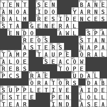ACROSS 1. Portable shelter 5. Elected rep. 8. Object of repulsion 12. Small Philippine buffalo 13. Wedding promise 14. Entertaining tales 15. Lip ointment 16. Dwellings 19. R.R. building 20. Commissioned military rank 21. Inside; within (prefix) 23. Leather borer 24. Health resort 27. Vintage cars 30. Comedian Laurel of Laurel & Hardy 31. Michaelmas daisies 34. California wine valley 35. Pack (down) 38. Grayish beige 40. Of the mouth 41. _ vera 42. Manatee 44. Confederate soldiers (slang) 45. Drink excessively 46. Personal Computers (abbr.) 47. Actress Charlotte 50. Hereditary estate 53. Speakers 57. Apply (a substance) by light strokes 59. Supplying deficiencies 63. Assistant 64. First name in cosmetics 65. Animal enclosure 66. Hang loosely or laxly 67. Pull into pieces 68. Working for oneself (abbr.) 69. At sea DOWN 1. Bar bills 2. Related on the mother's side 3. Pitcher Ryan 4. Scottish cap 5. The founder of a family 6. Genesis locale 7. Characteristic smell of wine 8. Prohibit 9. Curve 10. Compass dir. 11. Curvy letter 14. Shout 17. Retirement account (abbr.) 18. Obsolete 20. Moves 22. Window treatments 24. Play the lead 25. Dad 26. Of or related to the anus 28. Baseball player Mel 29. Oceans 30. Overwhelmed 32. Regret 33. Argument over a trivial matter 35. Canvas cover 36. Actor Baldwin 37. Disorderly crowds 39. Environmental prefix 43. Musical composition 47. Hero or heavy, e.g. 48. "We ___ not amused" (Victoria) 49. Ingest 51. Goodbye (Sp.) 52. Dipping utensil 54. Native american tent (variation) 55. Baking chamber 56. Tear apart 58. Actor Lugosi 59. Put into a specified state 60. Purpose 61. Parent Teacher Assoc. 62. For each 63. Insect wing