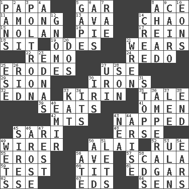 ACROSS 1. Dad 5. Slender fish 8. Adept person 11. Amid 13. Actress Gardner 14. US Secretary of Labor Elaine L. _ 15. Pitcher Ryan 16. Sliced dessert 17. It's straight from the horse's mouth 18. Be seated 19. Lyric poems 21. Puts on (as clothing) 22. San ____ (Riviera town) 24. Redecorate 25. Eats (away) 27. Purpose 29. The Jewish people; Israel 30. Removes the wrinkles 32. Pulitzer Prize-winning author Ferber 33. Japanese brewing company 35. Lie 39. Theater features 41. Presage 42. Mountains (abbr.) 43. Slept 45. Indian skirt 48. Celtic language 49. One who wires 50. Jai _ 52. Regret 55. Greek god of love 56. "___ Maria" 57. Any of the three canals of the cochlea 59. Trial 60. Teat (slang) 61. _ Allan Poe 62. Compass dir. 63. Begley and Asner 64. Elected reps. DOWN 1. Baking dishes 2. Mine, in Marseilles 3. Coward 4. Santa ___, CA 5. Stare wonderingly 6. Opinion 7. Actress Charlotte 8. Having the leading position 9. Capital of Egypt 10. Immeasurably long periods of time 12. Dwarf 14. Algonquian 20. Two (Sp.) 21. Songbird 23. Ferber et al. 25. Compass dir. 26. To free from 27. RI univ. 28. Male child 30. Big collection agency 31. Ceases 33. Krazy ___ of comics 34. It is 36. Electrical Measurement 37. Area sheltered from the wind 38. Conclude 40. Arab leader 43. Teachers' org. 44. Get up 45. Begets 46. Came up 47. Repose 49. Soaks 50. Enthusiastic 51. Allows 53. ____ Bator, Mongolia 54. Hearing organs 56. Had dinner 58. Music discs