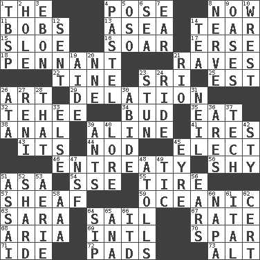 ACROSS 1. Definite Article 4. Introduce or present, as a question 8. Immediately 11. Moves up and down 13. At sea 14. Pull into pieces 15. _ gin 16. Fly high 17. Celtic language 18. Pre-World Series prize 21. All-night dance parties 22. Prong on a fork 23. Indian title of respect (Mr.) 25. Eastern Standard Time (abbr.) 26. Tate display 29. Accusation by an informer 32. Giggle 34. Partially opened flower 35. Ingest 38. Of or related to the anus 39. Place in a line 41. Angers 43. ___ a Wonderful Life 44. Dreamland 45. Choose 46. Plea 50. Like a shrinking violet 51. White ___ sheet 54. Compass dir. 55. Hoop that covers a wheel 57. Bundle of cut stalks of grain 59. Pertaining to the sea 63. "Two Mules for Sister ____" 64. Travel by water 67. Pace 68. Roberta Peters solo 69. International (abbr.) 70. Practice fight 71. Binary compound 72. Groovy apts. 73. The first octave above the treble staff DOWN 1. Cook's measure (abbr.) 2. Opening into or through something 3. Inky black, to poets 4. Soft color 5. Bear (Spanish) 6. Ocean 7. Ewer handle 8. Boldness 9. Fertile tracts in a desert 10. Take or capture by force 12. Transmitted 14. Beverage made from leaves 19. Assistant 20. Compass dir. 21. River (Sp.) 23. Astound 24. Travel on an animal 26. "One Day ___ Time" 27. Painter Guido (1575-1642) 28. Not this but _ 30. Remain 31. Famous astronaut Armstrong 33. Otherwise 36. Ancient Greek god of war 37. Technical 39. Pismires 40. Old wives' tales, e.g. 42. Filthy place 45. Jane of fiction 47. Science/research agcy. 48. Ringlike coral islands and reefs 49. Nervous spasm 51. Slender Brazilian palm 52. Broken piece 53. Nest on high 56. Hearing organs 58. Auto club (abbr.) 60. California wine valley 61. Slanted text style (abbr.) 62. Certainty 64. Small drink 65. Santa ___, CA 66. It would