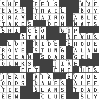 ACROSS 1. A female animal or person 4. Snakelike fish 8. "___ Maria" 11. Comfort 13. Go after with the intent to catch 15. Male child 16. Supercomputer manufacturer 17. Capital of Egypt 18. Competent 19. Proceeds 21. Lair 22. Floor protectors 23. _ Lanka 24. Corporate head (abbr.) 27. Republican Party 29. Thailand, formerly 30. Mole, birthmark 34. Trim (branches) 36. Travel on an animal 39. Wear away 40. Be footloose 41. Feeling sharp psychological pain 43. ____ Jay Lerner 44. Sea 46. Fly high 47. Set 48. Pig sounds 49. Become fatigued 51. Newt 53. Compass dir. 54. Part of HMS, perhaps 57. Rend 60. _ moment's notice (2 wds.) 63. Dodge 65. Likelihood 66. Natives or inhabitants of Denmark 69. Toward shelter 70. Neckwear 71. Hits or strikes with great force 72. Frog relative 73. Car or cant ending 74. A slight indication 75. Insidious DOWN 1. Religious groups 2. Ethiopian city, capital of Harari 3. 1973 Nobel Price Winner (Physics) Leo 4. And so on (abbr.) 5. Period 6. Put down 7. Title for a man of rank and authority 8. Swedish rock group 9. Electrical Unit 10. Sight organs 12. Sight organ 14. Yearn 18. Electrical Measurement 20. _-fi 25. Hearing organs 26. Leaves out 28. Single 29. Orators 31. Short-tailed, large-bodied rat 32. Hereditary estate 33. Elected rep. 34. Locales 35. Baking chamber 37. Superhero pair 38. Related on the mother's side 40. Friend of Pooh 42. Amused look 45. Science/research agcy. 50. To riddle 52. Bits 54. Rings 55. Perfect 56. Morally degraded 57. Carryall 58. Singer Brickell 59. An important port of Yemen 61. Baby powder 62. Of or related to the anus 64. Large container 67. Australian flightless bird 68. Compass dir.