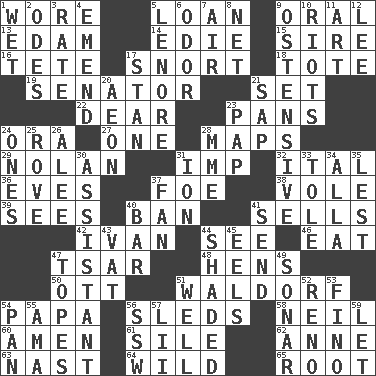 ACROSS 1. Had on 5. Grant temporary use of 9. Of the mouth 13. Dutch treat 14. Singer Brickell 15. Title for a man of rank and authority 16. Wig 17. Derisive sound 18. Carry 19. Elected representative 21. Arrange properly for use 22. Letter starter 23. Baking dishes 24. Mouth or opening 27. Single 28. Atlas contents 29. Pitcher Ryan 31. Mischievous child 32. Slanted text style (abbr.) 36. Nights before holidays 37. Enemy 38. Grand slam 39. Observes 40. Forbid 41. Makes a sale 42. "Terrible" tsar 44. Perceive with the eye 46. Consume 47. Russian ruler of old 48. Coop moms 50. Baseball player Mel 51. Apple salad 54. Dad 56. Bobsleighs 58. Famous astronaut Armstrong 60. So be it 61. Drop; flow; fall 62. Queen of England 1702-14 63. Political cartoonist Thomas 64. Uncontrolled 65. Carrot, for example DOWN 1. Soggy 2. Lyric poems 3. Pace 4. Make improvements or corrections to 5. Poe poem 6. Scent 7. Atmosphere 8. Remaining after all deductions 9. Clearly or manifestly demonstrative 10. Disturbances 11. Tate display 12. Area sheltered from the wind 17. Comedian Laurel of Laurel & Hardy 20. A really long time 21. Plant excrement 23. Infant food 24. Washington bills 25. Be footloose 26. Toward shelter 28. Madame (abbr.) 30. Aide 31. Electrically charged atom 33. Lacquered or enameled metalware 34. Silent film actress Nazimova 35. For fear that 37. Avid follower 40. Drinking establishment 41. Post 43. Large container 44. Cast a shadow over 45. Snakelike fish 47. Drinks excessively 49. Echolocation 51. Water source 52. Western Nevada city 53. A pale, very dry sherry 54. Baking dish 55. Nanny (var.) 56. Compass dir. 57. Cards in a Roman deck? 59. Allow
