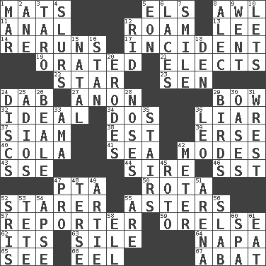 ACROSS 1. Floor protectors 5. Raised railways 8. Leather borer 11. Of or related to the anus 12. Wander 13. Area sheltered from the wind 14. Summer TV shows 17. Happening 19. Declaimed 21. Chooses 22. Play the lead 23. Elected rep. 24. Pat or tap gently 27. Soon (poet.) 29. Arrow shooter 32. Perfect 34. Two (Sp.) 36. One who doesn't tell the truth 37. Thailand, formerly 38. Eastern Standard Time (abbr.) 39. Celtic language 40. Root beer relative 41. Ocean 42. Methods 43. Compass dir. 44. Father 46. Fast jet (abbr.) 47. Parent Teacher Assoc. 50. Round or rotation of duties 52. A viewer who gazes fixedly 55. Michaelmas daisies 57. Newsperson 59. Threatening words 62. It is 63. Filth; sediment 64. California wine valley 65. Observe 66. Snakelike fish 67. Blind as ____ DOWN 1. Make imperfect 2. One (Scot) 3. Edible starchy tuberous root 4. Disparaging remarks 5. Period of immesurable duration 6. Shoestrings 7. Grin 8. Actor Baldwin 9. Gone 10. Allows 12. To free from 15. Brizilian seaport 16. Comedian Laurel of Laurel & Hardy 18. Lair 20. Eats (away) 24. Plates 25. Goodbye (Sp.) 26. Memphis, Tenn. Street 28. Olfactory organs 29. Avian creatures 30. Fertile tracts in a desert 31. Obtain by seizing forcibly or violently 33. Nanny (var.) 35. Flight of steps 36. Lion 42. Distance measurement 45. Printing process, for short 47. Adept person 48. Laconic 49. Nick name for Arthur 51. Sports stadium 52. Indian titles of respect 53. Wig 54. Domed church section 55. "We ___ not amused" (Victoria) 56. Thick slice 58. Pipe bend 60. Health resort 61. Consume