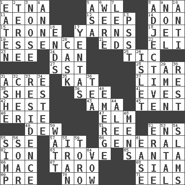 ACROSS 1. Inactive volcano in Sicily 5. Leather borer 8. Santa ___, CA 11. Period of immesurable duration 12. Ooze 14. Spanish title 15. Heavy duty weighing machine 17. Tall tales 18. Type of plane 19. Center 21. Begley and Asner 22. Biblical high priest 23. Born 24. One of the 12 tribes of Israel 25. Nervous spasm 27. Fast jet (abbr.) 28. Play the lead 31. Measure of real estate 35. Krazy ___ of comics 37. Citrus frut 38. "______ My Girl" (Turtles hit) 39. Observe 41. Nights before holidays 42. Behest 43. Nanny (var.) 45. Portable shelter 46. 4th largest of the Great Lakes 47. Shade tree 49. Morning condensation 51. To sift 52. Followers of ems 55. Compass dir. 57. Small island 60. Commissioned military rank 62. Electrically charged atom 63. Collection of objects 65. Before Barbara or Clara 66. Big _ 67. Edible starchy tuberous root 68. Thailand, formerly 69. Before (prefix) 70. Immediately 71. Snakelike fish DOWN 1. Ingested 2. Laconic 3. Trap for birds or small mammals 4. Queen of England 1702-14 5. White ___ sheet 6. We are 7. Grant temporary use of 8. Descriptive word 9. Christmas carol 10. Against 13. Inconspicuous attention getter 16. Conclusions 17. Gossips 20. Keg 26. Small island 29. So be it 30. Remainder 31. American tennis player Robert 32. "Mermaids" star 33. Home 34. First name in cosmetics 36. Beverage made from leaves 40. Develop 44. Toward shelter 48. Not women's 50. Electrical Unit 52. Bert's buddy 53. Relating to or accompanying birth 54. Shuts with force 55. Simple or foolish person 56. Fly high 58. SW Asia republic 59. "Corrida" creature 61. Relaxation 64. Promise