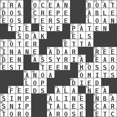 ACROSS 1. Lyricist Gershwin 4. Sea 9. Water vessel 13. Two (Sp.) 14. Streamer paper 15. Competent 16. Greek goddess of the dawn 17. Laconic 18. Grant temporary use of 19. Make a knot 21. Sight organ 22. Eucharist need 24. Neighbor of Neb. 26. Raised railways 27. Carrier 29. Singer James 30. Silly 31. The sixth month of the Jewish calendar 33. To sift 36. Lair 37. Nineveh was its capital 40. Hearing organ 41. Eastern Standard Time (abbr.) 42. Adolescent 43. With motion or animation 45. Small Philippine buffalo 47. Leaves out 48. Trim (branches) 49. Passed on 50. Eats 52. In the manner of 54. Teachers' org. 56. Simple or foolish person 57. Place in a line 59. Basketball assoc. 61. Clip 62. Stories 63. 4-wheeled motor vehicle 64. "Corrida" creature 65. Came up 66. And so on (abbr.) DOWN 1. Binary compound 2. Carrot, for example 3. Aide 4. Sep. follower 5. Small stream 6. Suggestive of the supernatural 7. Domed church section 8. Born 9. Greek mezzo-soprano Agnes 10. Mitch Miller's instrument 11. ____ Jay Lerner 12. Nine, plus one 20. Locale of original sin 22. _ dish (used to culture cells) 23. The first octave above the treble staff 25. Length times width 27. Periodic rise and fall of the sea level 28. Singles 29. Merit 31. Toward the sea 32. Color 33. Home 34. Compass direction 35. Greek god of love 38. Halts 39. Mine, in Marseilles 44. Presage 45. City in Syria 46. Allow head to fall sleepily 49. Natives or inhabitants of Denmark 50. Fine (Spanish) 51. Independent ruler or chieftain 52. Having or resembling wings 53. _ and Stitch 55. Blind as ____ 56. Fast jet (abbr.) 57. "One Day ___ Time" 58. Compass dir. 60. Curve