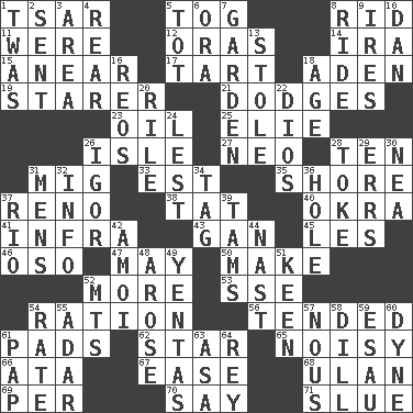 ACROSS 1. Russian ruler of old 5. Coat; cloak 8. To free from 11. Past tense of be (plural) 12. Mouths or openings 14. Retirement account (abbr.) 15. Approach 17. Small pie 18. Arabian gulf 19. A viewer who gazes fixedly 21. Evades 23. Lubricate 25. Writer Wiesel 26. Small island 27. Modern: prefix 28. "___ Little Indians" 31. Russian fighter aircraft 33. Eastern Standard Time (abbr.) 35. Dinah or Pauly 37. Western Nevada city 38. Make lace 40. Gumbo ingredient 41. Kind of red light 43. Separate the seeds from cotton 45. French article 46. Bear (Spanish) 47. Can I? 50. Create 52. Greater amount 53. Compass dir. 54. Food allowance for one day 56. Watched over 61. Writing tablets 62. Play the lead 65. Annoyingly loud 66. "One Day ___ Time" 67. Relaxation 68. ____ Bator 69. For each 70. Declare 71. Change direction abruptly DOWN 1. It was, poetically 2. Transmitted 3. Type of rug 4. Posterior 5. Small child 6. Mouth or opening 7. Place where plants grow 8. Travel on or in a vehicle 9. Angers 10. One of the 12 tribes of Israel 13. Fur scarf 16. Vintage cars 18. Personal question 20. Cause heat under the collar 22. "Vaya con ____" 24. For fear that 26. Composer Stravinsky 28. Casino tip 29. Blunders 30. Teachers' org. 31. Not women's 32. Information 34. Label 36. Opening into or through something 37. _ de Janeiro 39. Scottish caps 42. Mine, in Marseilles 44. Political cartoonist Thomas 48. Came up 49. Gossips 51. Peachy ____! 52. Mountains (abbr.) 54. Assign a rank or rating to 55. The sixth month of the Jewish calendar 57. Horse sense 58. Deli pickle 59. Son of Isaac 60. Centimeter-gram-second unit of force 61. Infant food 63. White ___ sheet 64. Marina Del _, California