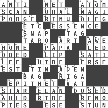 ACROSS 1. Against 5. Remaining after all deductions 8. Tiny particle 12. Examine hastily 13. Relating to the mouth 15. Wise men 16. Porridge 18. Tall New Zealand timber tree 19. Cassini of fashion 20. And so on (abbr.) 22. Gist 24. Fastener 26. Label 27. Pacific island yam 28. Nonscientific branch of learning 29. Deep reverence 32. Dwelling 35. Dad 37. Directed 38. Wrote a lyric poem 39. Mouth edge 40. Suttee (variant) 41. Area sheltered from the wind 42. Flintstone garb 43. Celtic language 44. Eastern Standard Time (abbr.) 45. Shallow baking pan 46. An important port of Yemen 49. Paper or plastic container 50. Port city in Latvia 51. Curse 55. Large container 56. Play the lead 57. Flair 59. Administered medicine 63. Old (Scot.) 64. Travel on or in a vehicle 65. San ____ (Riviera town) 66. Sliced desserts 67. Compass dir. 68. Make senseless or dizzy DOWN 1. Cleo's killer 2. Non-commissioned officer (abbr.) 3. Small boy 4. Eaten 5. And not 6. One of the Great Lakes 7. Scottish caps 8. Amid 9. Baby powder 10. Double curve, resembling the letter S 11. Russian fighter aircraft 14. A period of five years 17. Inactive volcano in Sicily 21. Automobile 23. Consume 25. Cotton for raincoats, e.g. 28. Seem 29. Having or resembling wings 30. Soaks 31. Singer Brickell 32. Hollow 33. Lyric poems 34. Confront 36. Help 40. Elected representatives 42. Having greater elevation 45. Make lace 47. HTML Container Element 48. Mild oath 49. Avian creatures 51. Needle case 52. Diluted with white 53. Writer Wiesel 54. Bits 56. Plant excrement 58. Born 60. Put into a specified state 61. Australian flightless bird 62. Spanish title