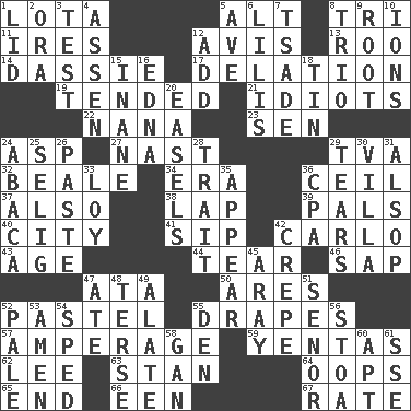 ACROSS 1. Globular water bottle used in Asia 5. The first octave above the treble staff 8. Three (prefix) 11. Angers 12. Deliberation 13. Friend of Pooh 14. Hyrax 17. Accusation by an informer 19. Looked after 21. Foolish or stupid persons 22. Nanny 23. Elected rep. 24. Cleo's killer 27. Political cartoonist Thomas 29. Federal power corp. 32. Calif. Air Force Base 34. Epoch 36. To provide with a ceiling 37. In addition 38. Infant locale 39. Friends 40. Municipality 41. Small drink 42. Monte _, Las Vegas Hotel/Casino 43. Ripen 44. Lacerate 46. Plant excrement 47. _ moment's notice (2 wds.) 50. Ancient Greek god of war 52. Soft color 55. Window treatments 57. Electrical Measurement 59. Gossips 62. Area sheltered from the wind 63. Comedian Laurel of Laurel & Hardy 64. I made a mistake 65. Conclusion 66. Car or cant ending 67. Assign a rank or rating to DOWN 1. Flaplike covering 2. Mouth or opening 3. Trial 4. NE Netherlands city 5. "___ Maria" 6. Ms. Damita and namesakes 7. Sadhe (variant) 8. Musical group of three 9. Carrot, for example 10. Charged atoms 12. Find the sum of 15. Lacking in sense or substance 16. Pulitzer Prize-winning author Ferber 18. Shallow baking pan 20. Artist's stands 24. Phillipine bananalike plant 25. Major League Baseball Commissioner Bud 26. Thick mixture 28. Distinguishing feature 29. Pulls apart 30. Country estate 31. Columnist Joseph or Stewart 33. Myrna of the movies 35. Become visible 36. Tax preparer (abbr.) 42. Streamer paper 45. Like ___ of sunshine 47. Had dinner 48. Laconic 49. Having winglike extensions 51. Sir (Sp.) 52. Light colored 53. So be it 54. Hurried 55. Lair 56. Portico 58. Separate the seeds from cotton 60. Fitting 61. Compass dir.