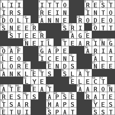 ACROSS 1. Cards in a Roman deck? 4. "Tell ____ the Marines!" 8. State of inaction 12. Big collection agency 13. It's straight from the horse's mouth 14. To the inside or interior of 15. Dunce 17. Singer Murray 18. Cowboy competition 19. Contemptuous expression 21. Indian title of respect (Mr.) 23. Baseball player Mel 24. Bull 26. Personal question 28. Famous astronaut Armstrong 30. Rending 34. Clumsy lout 37. Open wide 39. Operatic vocal solo 40. Lion 41. Ancient Celtic tribe of eastern Britain 43. Keyboard modifier key 44. Old wives' tales, e.g. 46. Conclusions 47. Born 48. Short socks 51. Narrow board 54. Sodium hydroxide 55. Voters do this 58. Had dinner 61. Erode 63. Composer Copland 65. Musical pauses 67. Domed church section 71. Assign a rank or rating to 72. Russian ruler of old 73. Atlas contents 74. Affirmative reply 75. Needle holder 76. Argument over a trivial matter 77. Fast jet (abbr.) DOWN 1. Hats (slang) 2. Removes the wrinkles 3. Small island 4. Retirement account (abbr.) 5. "___ Little Indians" 6. Shallow baking pan 7. Washington bills 8. _ de Janeiro 9. Inside; within (prefix) 10. Proofreading order 11. A blast of a horn 16. Adolescent 18. Capital of Latvia 20. To riddle 22. Actress Charlotte 25. Swiss mountan, "Queen of the Mountains" 27. Epoch 29. Shoestrings 30. Watches over 31. SW Asia republic 32. The longest river in the world 33. Yard entry 34. Water jar 35. A really long time 36. Tined utensil 38. Animal enclosure 42. Capri or Wight 45. Pipe bend 49. Snake ____ (dice throw) 50. Beverage made from leaves 52. Chicken ___ king 53. Separate forcefully 56. Trading vessels 57. Lugs 58. Johnson of "Laugh-In" 59. Trial 60. He sold his birthright 62. Scottish caps 64. A home for chicks 66. Three (prefix) 68. Infant food 69. Health resort 70. Eastern Standard Time (abbr.)