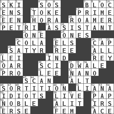 ACROSS 1. What Jean-Claude Killy likes to do 4. Mayday 7. Coalition 11. Followers of ems 12. Puff or smoke 13. A-one 14. Car or cant ending 15. Israeli folk dance 16. Nomad 17. _ dish (used to culture cells) 19. Aide 21. Single 23. Singles 24. Root beer relative 25. Raised railways 26. Head covering 29. Man with strong sexual desires 30. To riddle 31. 100% 32. Luau accessory 33. Working for oneself (abbr.) 34. Marina Del _, California 35. Rowing implement 36. _-fi 37. A sleeping potion; an opiate (poet.) 40. Adept person 41. Area sheltered from the wind 42. Billionth: prefix 43. Examine hastily 45. Keyboard modifier key 46. Casting lots 51. Climbing, woody, usually tropical vines 55. Foolish or stupid persons 56. Not recorded 58. Infant food 59. Impressive in appearance 60. Set down 61. Big collection agency 62. Celtic language 63. Opposite of masc. 64. Adept person DOWN 1. Ooze 2. Leg joint 3. Is not 4. "Barney Miller" actor Jack 5. Gumbo ingredient 6. Oceans 7. Naughty children 8. Pale green bean 9. Sign of things to come 10. Foregone conclusion 12. Without viscosity 13. Airs 16. Wash lightly 18. Carrot, for example 20. Having a sole or soles 22. Ewer handle 24. Capital of Egypt 25. Bert's buddy 26. Monte _, Las Vegas Hotel/Casino 27. Toward shelter 28. Strand of rope, yarn or thread 29. Singe 32. Trim (branches) 33. Ancient Celtic tribe of eastern Britain 36. Narrow boards 37. Heredity factor (abbr.) 38. Place for singles 39. Against 43. Took without asking 44. Quote 46. Trig term 47. Scent 48. Teases 49. Norwegian king 50. Mediterranean tributary 52. Capital of Western Samoa 53. Drug cop 54. Domed church section 57. Zeal