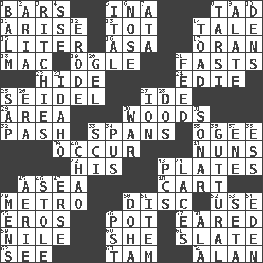 ACROSS 1. Drinking establishments 5. _ tizzy (2 wds.) 8. Small boy 11. Get up 13. Small child 14. Story 15. 61 cubic inches 16. White ___ sheet 17. Northwest Algerian city 18. Apple computer (short form) 19. Stare 21. Goes without food and/or water 22. Flintstone garb 24. Singer Brickell 25. Beer mug 27. Binary compound 29. Type of rug 30. Forest 32. Romantic infatuation 33. Connects, as a bridge 35. Double curve, resembling the letter S 39. Come to pass 41. Religious women 42. Part of HMS, perhaps 43. Food holders 45. At sea 48. Haul 49. Paris' subway 50. Compact _ 52. Purpose 55. Greek god of love 56. Cooking vessel 57. Having ears or earlike features 59. Mediterranean tributary 60. A female animal or person 61. Schedule 62. Observe 63. Scottish cap 64. Actor Alda or Thicke DOWN 1. Lip ointment 2. Operatic vocal solo 3. Actors Guy, Robert Welles, and Clint 4. Compass dir. 5. Slanted text style (abbr.) 6. Sense of smell 7. _ moment's notice (2 wds.) 8. Tarsus (plural) 9. Having winglike extensions 10. Habitations of wild animals 12. Eat (away) 14. Frog relative 20. Set 21. Nourish 23. Potato state 25. Plant excrement 26. Period 27. Electrically charged atom 28. Two (Sp.) 30. Armed conflict 31. Echolocation 33. _-fi 34. Product of festering 36. From the throat 37. Compass dir. 38. Double-curved letter 40. US Secretary of Labor Elaine L. _ 43. Personal Computers (abbr.) 44. Shoestrings 45. Nest on high 46. Took without asking 47. Celtic language 49. Not women's 50. Capital of the state of Qatar 51. A distinct part 53. Bristle 54. Paradise 56. Pacific Standard Time (abbr.) 58. Chicken ___ king