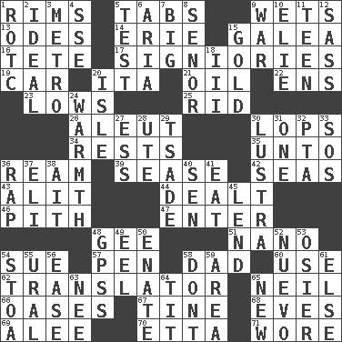 ACROSS 1. Basketball hoops 5. Bar bills 9. Moistens 13. Lyric poems 14. One of the Great Lakes 15. An organ shaped like a helmet 16. False hair 17. Seigniories (variant) 19. 4-wheeled motor vehicle 20. Call ___ day 21. Lubricate 22. Followers of ems 23. Coldest temperatures 25. To free from 26. Eskimo relative 30. Chops off 34. Musical pauses 35. To (old English) 36. 480, 500 or 516 sheets of paper 39. Gospel singer Marvin 42. Oceans 43. Set down 44. Started a card game 46. Heart or essence 47. Keyboard key 48. Turn to the right 51. Billionth: prefix 54. Take to court 57. Animal enclosure 58. June honoree 60. Purpose 62. Interpreter 65. Famous astronaut Armstrong 66. Fertile tracts in a desert 67. Prong on a fork 68. Nights before holidays 69. Toward shelter 70. Singer James 71. Had on DOWN 1. College mil. group 2. Standard of perfection 3. Paris' subway 4. Compass dir. 5. Trial 6. Roberta Peters solo 7. Of large size 8. Sir (Sp.) 9. Armed conflict 10. Writer Wiesel 11. Adolescent 12. Backtalk 15. Gilt 18. One more than two 20. Small island 24. Heat 27. Double-curved letter 28. Shoshoni 29. Sadhe (variant) 30. A period of five years 31. Single 32. Parent Teacher Association (abbr.) 33. Distress signal 36. Strike 37. Connecticut Ivy Leaguer 38. Small island 40. Elected rep. 41. Consume 45. Grant temporary use of 48. Global Positioning Systems (abbr.) 49. Snakelike fish 50. Related on the mother's side 52. New (sp.) 53. Flexible twig of a willow tree 54. Portico 55. Mountain range 56. Comfort 58. Do not 59. Length times width 61. Otherwise 63. Born 64. Teat (slang) 65. ___ Haven, CT