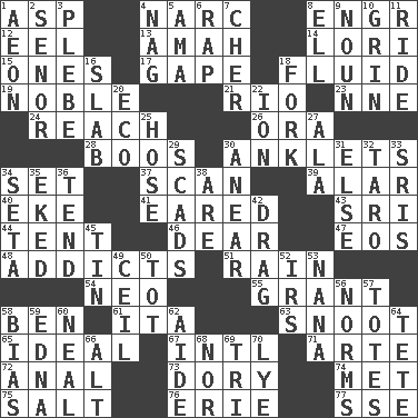 ACROSS 1. Cleo's killer 4. Drug cop 8. Engineer (abbr.) 12. Snakelike fish 13. Wet nurse 14. Australian parrot (variant) 15. Singles 17. Stare wonderingly 18. Watery 19. Having high moral qualities 21. River (Sp.) 23. Compass dir. 24. Arrive at 26. Mouth or opening 28. Expressions of contempt or scorn 30. Short socks 34. Put into a specified state 37. Skim 39. Having or resembling wings 40. Make supply last 41. Having ears or earlike features 43. Indian title of respect (Mr.) 44. Portable shelter 46. Letter starter 47. Greek goddess of the dawn 48. Inveterate users 51. Water falling in drops from the sky 54. Modern: prefix 55. Monetary aid 58. Benjamin's nick name 61. Call ___ day 63. Snob 65. Perfect 67. International (abbr.) 71. Johnson of "Laugh-In" 72. Of or related to the anus 73. Rowboat 74. Was introduced to 75. Table seasoning 76. One of the Great Lakes 77. Compass dir. DOWN 1. Period of immesurable duration 2. Sir (Sp.) 3. Military trainee 4. Tired old horse 5. Nursemaid (var.) 6. Reproach for some lapse or misdeed 7. "Mermaids" star 8. Pipe bend 9. Part of speech 10. Smile widely 11. Travel on or in a vehicle 16. Broad, flat, thick piece 18. Tined utensil 20. Environmental prefix 22. Electrically charged atom 25. Stockings 27. Chicken ___ king 29. Oodles 30. Approach 31. Otherwise 32. Edible starchy tuberous root 33. Indian titles of respect 34. Bristle 35. Supplemented with great effort 36. Watch over 38. "We ___ not amused" (Victoria) 42. To trail on the ground 45. Shallow baking pan 49. To provide with a ceiling 50. Small child 52. Big collection agency 53. Nanny 56. Typical models 57. Hauls 58. Prejudice 59. Pulitzer Prize-winning author Ferber 60. Actress Patricia 62. Helper 64. False hair 66. The first octave above the treble staff 68. Not either 69. Three (prefix) 70. Sodium hydroxide