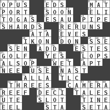 ACROSS 1. Musical composition 5. Begley and Asner 8. Floor protector 11. Sweet dark-red dessert wine 12. Within a short period 14. Connecticut Ivy Leaguer 15. Ancient Roman robes 17. Son of Isaac 18. Corncob 19. Broken pieces 21. Summer TV shows 23. _ moment's notice (2 wds.) 25. Nights before holidays 26. Image 27. Spanish title 28. Compass dir. 31. Elected rep. 33. Increase 35. _____ Park, CO 37. Eighteen holes 38. Consenting reply 40. Chops off 41. Columnist Joseph or Stewart 43. Dripping 45. Fitting 46. Born 47. Purpose 50. Political cartoonist Thomas 52. Silent film actress Nazimova 53. Affectionate concern, for short 54. Triads 56. Device for capturing images 61. Coral collection 62. Tenth: prefix 65. Lies 66. Shoshoni 67. Slit 68. Prong on a fork 69. Snakelike fish 70. R.R. building 71. Stalk of a moss capsule DOWN 1. Chooses 2. "Silly old bear" 3. Capital and largest city of Mongolia 4. Play the lead 5. Compass dir. 6. Two (Sp.) 7. Flew 8. Count _ (2 wds.) 9. High mountains 10. Neckwear 13. New (sp.) 16. Neighbor of Neb. 18. Product of festering 20. Portico 22. French philosopher Descartes 24. Actor Griffith 26. Information 28. Cease 29. Back-to-school mo. 30. Curvy letter 31. Not divided or shared with others 32. Otherwise 34. Morning condensation 36. Narrow board 37. Separate the seeds from cotton 39. Transmitted 42. Whimper 44. Baby powder 48. Bobsleighs 49. Artist's stands 51. Get outta here! 52. Sandy's bark 54. False hair 55. Person who is morally reprehensible 57. Floor coverings 58. Writer Wiesel 59. Monthly bill 60. At sea 61. Regret 63. Small bed 64. Call ___ day