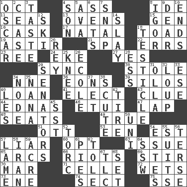 ACROSS 1. Sep. follower 4. Backtalk 8. Binary compound 11. Oceans 13. Baking chambers 15. Commissioned military rank (abbr.) 16. Keg 17. Brizilian seaport 18. Frog relative 19. Having gotten out of bed 21. Health resort 22. Blunders 23. To separate or throw off 24. Supplement with great effort 27. It is so 29. Synchronize (abbr.) 30. Took without asking 34. Compass dir. 36. Immeasurably long periods of time 39. Grain storage towers 40. Grant temporary use of 41. Voters do this 43. A slight indication 44. Ferber et al. 46. Needle case 47. Pet locale 48. Theater features 49. Loyal 51. Baseball player Mel 53. Car or cant ending 54. Eastern Standard Time (abbr.) 57. One who doesn't tell the truth 60. Elect 63. Come out of 65. Curves 66. Disturbances 69. Agitate 70. Third mo. 71. Cell (Danish) 72. Soaks 73. Compass dir. 74. Religious group 75. Compass dir. DOWN 1. Motion picture award 2. Desist 3. Clothes sense 4. Boy, to dad 5. Actress Gardner 6. Puts into a specified state 7. Fastener 8. Composer Stravinsky 9. Letter starter 10. Extremities 12. What Jean-Claude Killy likes to do 14. Kill 18. A testis 20. Marina Del _, California 25. Leg joint 26. Learning spot: Fr. 28. Double-curved letter 29. Legislators 31. Rounded earthenware pot or jar 32. Central Nebraska county 33. Compass dir. 34. Connecting point 35. Grandmother 37. Fish or hair follower 38. Scutum 40. French article 42. Become fatigued 45. Fast jet (abbr.) 50. Single; one (prefix) 52. Torque (variant) 54. _____ Park, CO 55. Sets of matching outer garments 56. Laconic 57. Unable to walk 58. SW Asia republic 59. Measure of real estate 61. Sliced desserts 62. Lacquered or enameled metalware 64. Compass dir. 67. Affectionate concern, for short 68. Put into a specified state