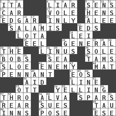 ACROSS 1. Call ___ day 4. One who doesn't tell the truth 8. Elected reps. 12. Automobile 13. Short-tailed, large-bodied rat 14. Coop moms 15. _ Allan Poe 18. In an inward manner 19. Toward shelter 20. Deli grouping 22. Begley and Asner 23. Globular water bottle used in Asia 24. Flowery wreath 25. Snakelike fish 26. Commissioned military rank 30. Definite Article 33. "_ and Lucy" (Charlie Brown theme song) 36. Flatfish 37. Moves up and down 39. Ocean 40. Scottish caps 41. _ gin 42. Foe 44. Floor covering 45. Pre-World Series prize 47. Greek goddess of the dawn 50. Assist 51. Actor's bit 53. Baseball player Mel 54. Crying or shouting loudly 57. Through, poetically 59. Inventor's middle name 61. Practice fights 63. Posterior 64. Institutes legal proceedings 65. The 19th letter of the Greek alphabet 66. Restaurants 67. Introduce or present, as a question 68. Compass dir. DOWN 1. Frozen water 2. Small amounts or degrees 3. Therefore, facetiously 4. 57 in ancient Rome 5. Charged atoms 6. 100% 7. Marina Del _, California 8. Most dark, concealed or hidden 9. Snakelike fish 10. Compass dir. 11. Compass dir. 16. Medicinal plant 17. Assign a rank or rating to 21. Shopping center 22. Car or cant ending 24. French article 26. Island territory of the United States 27. Wander aimlessly 28. _ mater 29. For fear that 30. Cook's measure (abbr.) 31. Hollow 32. Inky black, to poets 34. Is not 35. Born 38. Legislators 42. Conclusion 43. Shout 46. Small island 48. Lubricates 49. Clip 52. Maternal 53. NW Algerian seaport 54. Jacques Cousteau's middle name 55. Comfort 56. Pate de foie ____ 57. Three (prefix) 58. Layer 59. Cleo's killer 60. Nilotic language 62. Take to court