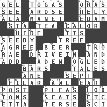 ACROSS 1. Set 4. Ancient Roman robes 9. Mouths or openings 13. Perceive with the eye 14. Came up 15. Trust 16. Chicken ___ king 17. French painter Edouard 18. Dutch treat 19. R.R. building 21. Afternoon social gathering 22. Bodily heat indicating an inflammation 24. Flintstone garb 26. It is 27. Sleazy 29. Woody plant 30. Match 31. Fermented drink made from hops 33. Ring climax 36. Actress Charlotte 37. Popular '50s hangout 40. Also 41. Increase 42. Arabian gulf 43. Stared 45. Drinking establishments 47. Stories 48. A saturated hydrocarbon 49. Back-to-school mo. 50. Of or pertaining to a thread or threads 52. Leather borer 54. Ewer handle 56. Mail 57. Entreaties 59. Brine-cured salmon 61. Charged particles 62. Theater features 63. And so on (abbr.) 64. Singer James 65. Laconic 66. _-fi DOWN 1. Girls' org. (abbr.) 2. Snakelike fish 3. Resembling or made to resemble leather 4. Scottish cap 5. Declaim 6. Went 7. At sea 8. Put into a specified state 9. Threatening words 10. Redecorate 11. Having or resembling wings 12. Symbol (abbr.) 20. Helper 22. High-altitude cloud 23. Had dinner 25. Colored 27. "Two Mules for Sister ____" 28. Mild oath 29. Adolescent 31. Auction offers 32. Night before a holiday 33. Baron Munchausen's specialties 34. Leg joint 35. Likelihood 38. More valued for its uncommonness 39. Observe 44. Open wide 45. Greek mezzo-soprano Agnes 46. Santa ___, CA 49. Narrow boards 50. One third of a yard 51. Is not 52. Toward shelter 53. Put on (as clothing) 55. College mil. group 56. Sliced dessert 57. Pacific Standard Time (abbr.) 58. Compass dir. 60. One more than ninety