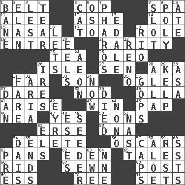 ACROSS 1. Waist strap 5. Police officer (slang) 8. Health resort 11. Toward shelter 12. American tennis player Robert 14. Car dealer's back yard 15. Rhinal 17. Frog relative 18. Hero or heavy, e.g. 19. Main course 21. Noteworthy scarcity 23. Beverage made from leaves 25. Margarine 26. Capri or Wight 27. Elected rep. 28. Alias (abbr.) 31. At a great distance 33. Male child 35. Stares at amorously 37. Have the gumption 38. Dreamland 40. Spanish pot 41. Get up 43. Victory 45. Infant food 46. Teachers' org. 47. Consenting reply 50. Immeasurably long periods of time 52. Celtic language 53. Heredity factor (abbr.) 54. Keyboard key 56. Motion picture awards 61. Zero-star reviews 62. Paradise 65. Stories 66. To free from 67. Stitched 68. Mail 69. Double-curved letter 70. To separate or throw off 71. Arranges properly for use DOWN 1. Object of repulsion 2. Enthusiasm 3. For fear that 4. Separate forcefully 5. Feline 6. Bear (Spanish) 7. N Egypt peninsula 8. Narrow opening 9. Much (prefix) 10. Had dinner 13. Peak District village in England 16. Allows 18. River (Sp.) 20. Snakelike fish 22. Former U.S. Attorney General Janet 24. A really long time 26. Angers 28. Silent film actress Nazimova 29. Seaweed 30. White ___ sheet 31. Conductor's collection 32. Operatic vocal solo 34. At this time 36. Republicans 37. Daniel's nick name 39. Passed on 42. Jane of fiction 44. Words to Nanette 48. _____ Park, CO 49. Sowing specialist 51. Political cartoonist Thomas 52. Raised railways 54. Raised platform 55. Conclusions 57. Smile enhancers 58. _ vera 59. Repose 60. Fast planes 61. Before (prefix) 63. She-sheep 64. Compass dir.