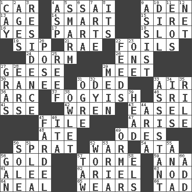ACROSS 1. 4-wheeled motor vehicle 4. Slender Brazilian palm 9. An important port of Yemen 13. Grow older 14. Don Adams' spy role 15. The founder of a family 16. It is so 17. Components 18. Slit 19. Small drink 21. Actress Charlotte 22. Fencing necessities 24. Dormintory (informal) 26. Followers of ems 27. Honkers 29. Rendezvous 30. Indian princess (variant) 31. Wrote a lyric poem 33. Wind 36. Curve 37. Out of fashion; old fashioned 40. _ Lanka 41. Compass dir. 42. Songbird 43. Artist's stand 45. Do some clerical work 47. Get up 48. Had dinner 49. Lyric poems 50. Small fatty European fish 52. Armed conflict 54. _ moment's notice (2 wds.) 56. Gilded 57. Singer Mel 59. Santa ___, CA 61. Toward shelter 62. Satellite of Uranus 63. Allow head to fall sleepily 64. Be tempered by heat 65. Puts on (as clothing) 66. Bit DOWN 1. Island 2. Eons 3. Dwelling 4. Cleo's killer 5. Excessive but superficial compliments 6. "Two Mules for Sister ____" 7. Johnson of "Laugh-In" 8. ___ a Wonderful Life 9. Help 10. Deli pickle 11. Greek god of love 12. Fish or hair follower 20. Airs 22. Eats 23. Single 25. Coral collection 27. Pate de foie ____ 28. Hearing organs 29. Chow _ 31. Legendary monster 32. Color 33. Helper 34. Angers 35. Cause heat under the collar 38. A small or young owl 39. Froth on beer 44. Type of rug 45. Burden 46. Call ___ day 49. Abalone 50. Not divided or shared with others 51. Entreaty 52. Had on 53. Operatic vocal solo 55. Small Philippine buffalo 56. Separate the seeds from cotton 57. The 23rd letter of the Hebrew alphabet 58. Raised railways 60. Find the sum of