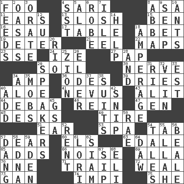 ACROSS 1. Egg _ yung 4. Indian skirt 8. White ___ sheet 11. Hearing organs 13. Agitate, as a liquid 15. Benjamin's nick name 16. Son of Isaac 17. Eating place 18. Collude with 19. Prevent from occurring 21. Snakelike fish 22. Atlas contents 23. Compass dir. 24. Ending with capital 27. Infant food 29. Land 30. Impudent aggressiveness 34. Electrical Unit 36. Lyric poems 39. Frees from moisture 40. _ vera 41. Mole, birthmark 43. Came down and settled, as after flight 44. Debunk (Brit. slang) 46. It's straight from the horse's mouth 47. Commissioned military rank (abbr.) 48. Writing tables 49. Hoop that covers a wheel 51. Hearing organ 53. Health resort 54. Bar bill 57. Letter starter 60. Raised railways 63. Peak District village in England 65. Does sums 66. Annoying sound 69. Silent film actress Nazimova 70. Compass dir. 71. Lag or linger behind 72. Welt 73. Separate the seeds from cotton 74. Body of Kaffir warriors 75. A female animal or person DOWN 1. Eats 2. Fertile tracts in a desert 3. Speak pompously 4. Fast jet (abbr.) 5. According to 6. Loose flowing garment 7. Small island 8. Swedish rock group 9. Ooze 10. Pismires 12. Institute legal proceedings 14. Aid 18. Electrical Measurement 20. River (Sp.) 25. The Jewish people; Israel 26. A person who is older than you are 28. Added to 29. Orators 31. Cause heat under the collar 32. Distinctive style or manner 33. Eastern Standard Time (abbr.) 34. Toward shelter 35. Disorderly crowds 37. Night before a holiday 38. Sets of matching outer garments 40. Find the sum of 42. Clip 45. Girls' org. (abbr.) 50. Actress Charlotte 52. Monthly bill 54. Lies 55. Assad's deity 56. Memphis, Tenn. Street 57. Mild oath, euphamism for damn 58. Pulitzer Prize-winning author Ferber 59. An important port of Yemen 61. Australian parrot (variant) 62. Thailand, formerly 64. Simpleton 67. Small drink 68. Connecticut Ivy Leaguer
